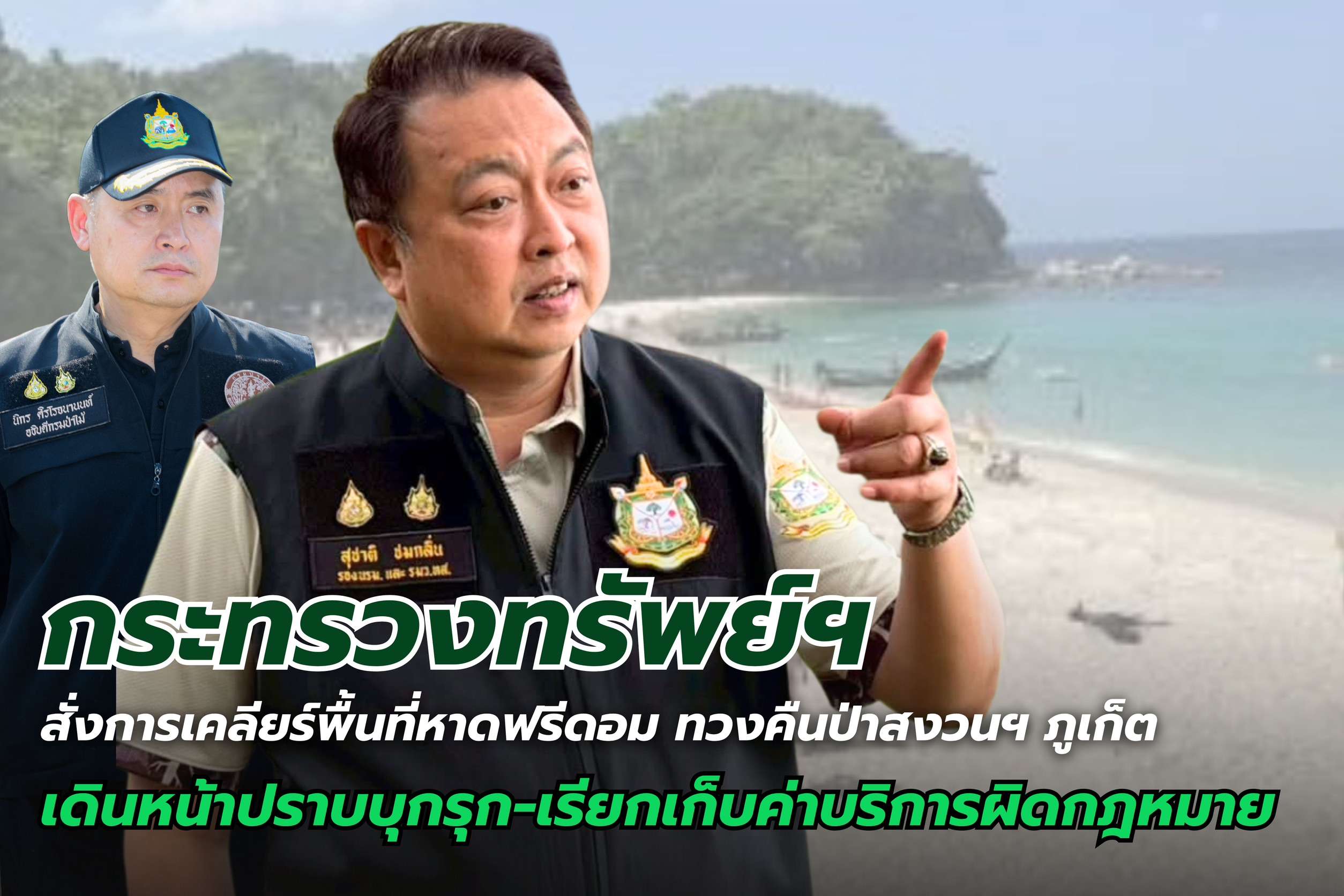ภูเก็ต, วันที่ 17 มีนาคม – นายสุชาติ ชมกลิ่น รองนายกรัฐมนตรี และรัฐมนตรีว่าการกระทรวงทรัพยากรธรรมชาติและสิ่งแวดล้อม (รมว.ทส.) สั่งการให้ กรมป่าไม้ ร่วมกับหน่วยงานที่เกี่ยวข้องเร่งตรวจสอบและแก้ไขปัญหาการบุกรุกพื้นที่ป่าสงวนแห่งชาติ และการเรียกเก็บค่าบริการจากนักท่องเที่ยวโดยมิชอบ ในพื้นที่ป่าสงวนแห่งชาติป่าเทือกเขานาคเกิด (หาดฟรีดอม) ตำบลกะรน อำเภอเมือง จังหวัดภูเก็ต นายนิกร ศิรโรจนานนท์ อธิบดีกรมป่าไม้ จึงมอบหมายให้นายโกสิทธิ์ นิลรัตน์ ผู้อำนวยการสำนักป้องกันรักษาป่าและควบคุมไฟป่า พร้อมด้วยนายฐิติวัชร์ สิทธิศิรินนท์ ผอ.สำนักจัดการทรัพยากรป่าไม้ที่ 12 สาขากระบี่ นายนฤเศรษฐ แก้วคง ผอ.ศูนย์ป้องกันและปราบปรามที่ 4 (ภาคใต้) นายสัมพันธ์ มีสิทธิ์ ผอ.ศูนย์ป่าไม้ภูเก็ต และนายสรศักดิ์ รณะนันทน์ หัวหน้าป่านันทนาการเขาโต๊ะแซะ สนธิกำลังร่วมกับ นายรุ่งเรือง ธิมาบุตร พร้อมเจ้าหน้าที่จากกองบังคับการปราบปรามการกระทำความผิดเกี่ยวกับทรัพยากรธรรมชาติและสิ่งแวดล้อม (บก.ปทส.) กองกำกับการตำรวจตระเวนชายแดนที่ 425 และสถานีตำรวจภูธรกะรน รวมกำลังกว่า 100 นาย ลงพื้นที่ตรวจสอบ