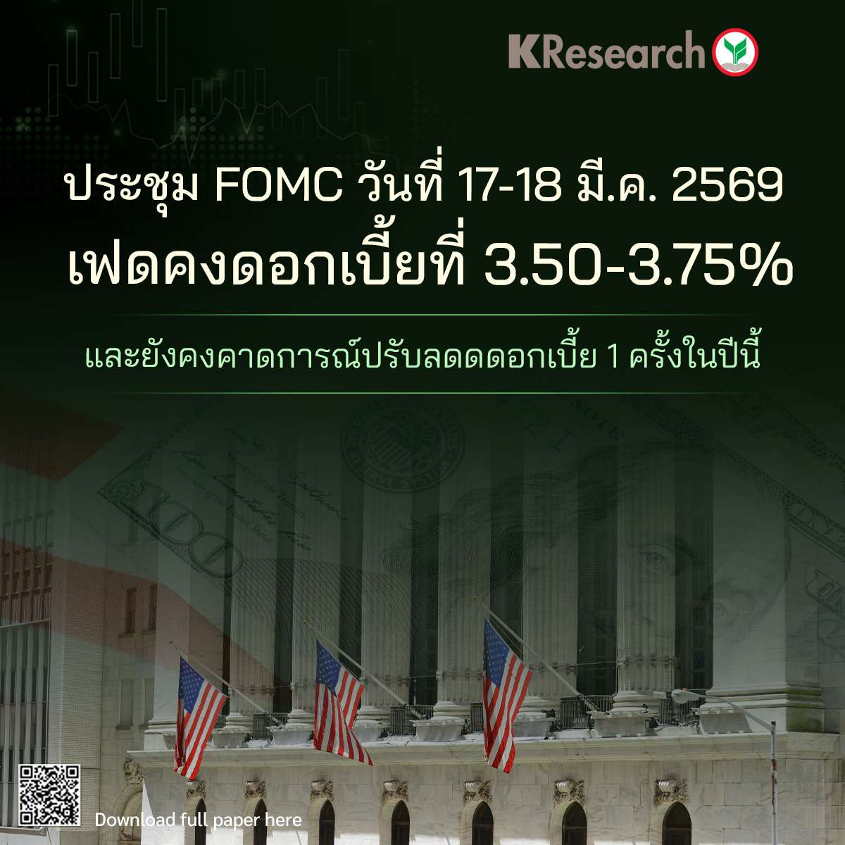 กรุงเทพฯ, วันที่ 19 มี.ค. – ศูนย์วิจัยกสิกรไทย เปิดเผยว่า ในการประชุมคณะกรรมการกำหนดนโยบายการเงินของรัฐบาลกลางสหรัฐฯ (FOMC) เมื่อวันที่ 17-18 มี.ค. ที่ผ่านมา ธนาคารกลางสหรัฐ หรือ เฟดมีมติไม่เป็นเอกฉันท์ 11 ต่อ 1 เสียง คงดอกเบี้ยนโยบายที่ 3.50-3.75% ตามที่ศูนย์วิจัยกสิกรไทยคาดไว้ก่อนหน้านี้ โดยมีเพียง Stephen Miran ที่ลงมติให้ปรับลดดอกเบี้ย 0.25%