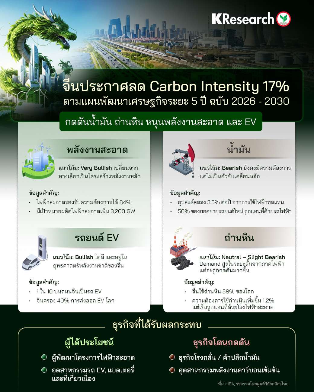 กรุงเทพฯ, วันที่ 20 มี.ค. –จากกรณีที่จีนประกาศเป้าหมายลดความเข้มข้นการปล่อยคาร์บอนต่อ GDP (Carbon Intensity) ลง 17% ระหว่างปี 2026 – 2030 ตามแผนพัฒนาเศรษฐกิจระยะ 5 ปี ฉบับใหม่ โดยกำหนดเป้าการปล่อย CO2 สูงสุด (peak emission) ในปี 2030 และตั้งเป้าเป็นกลางทางคาร์บอน (Carbon Neutrality) ในปี 2060 ศูนย์วิจัยกสิกรไทย ประเมินว่า จะส่งผลให้การลงทุนใน 4 กลุ่มพลังงานหลัก ได้แก่ พลังงานสะอาด รถยนต์ EV น้ำมัน และถ่านหิน มีแนวโน้ม Slight Bearish ถึง Very Bullish ในช่วง 5 ปีตามแผนดังกล่าว