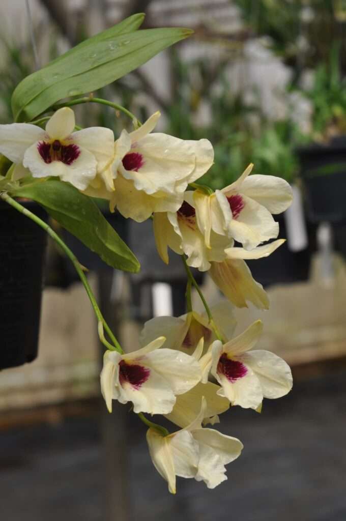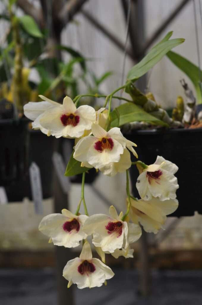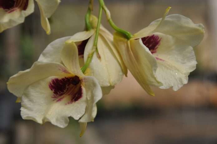 เมื่อถึงฤดูออกดอก ระหว่างเดือนกุมภาพันธ์ถึงมีนาคม ช่อดอกจะยื่นออกใกล้ปลายยอด ความยาวราว 15–20 เซนติเมตร แต่ละช่อมีเพียง 3–5 ดอก ราวกับตั้งใจให้ทุกดอกโดดเด่นอย่างสง่างาม กลีบดอกสีขาวหรือครีมนวล ตัดกับแต้มสีม่วงแดงบริเวณกลีบปากด้านใน เสมือนลวดลายที่ธรรมชาติบรรจงวาดขึ้นอย่างประณีต