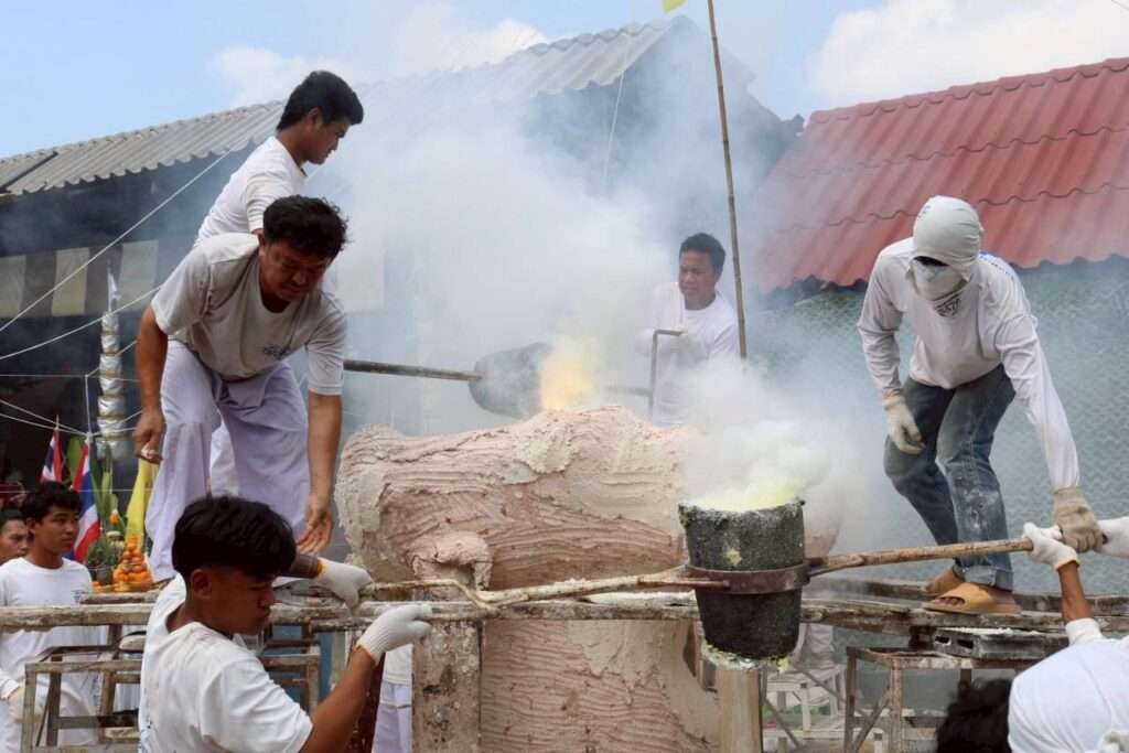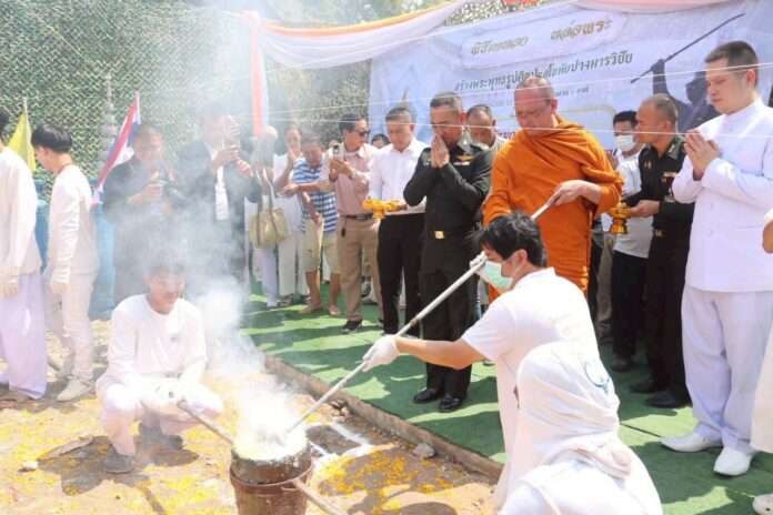 โดยพิธีช่วงเช้า ประกอบไปด้วย พระสงฆ์ จำนวน 9 รูป ได้ทำการเจริญพระพุทธมนต์ เพื่อเสริมสร้างบารมีให้แก่ผู้ที่เข้าร่วมงาน จากนั้นได้ทำการเททองหล่อพระ โดยมีพลตรี ตรีพจน์ โพธิสอน ผู้ทรงคุณวุฒิสำนักงานปลัดกระทรวงกลาโหม, พันเอก พรพิสุค์ บุญรอด ผู้บังคับกรมสนับสนุน กองพลทหารราบที่ 9 พร้อมด้วยทหารในหน่วย สังกัดกองพลทหารราบที่ 9 ญาติธรรมของมูลนิธิพุทธภูมิธรรม และ ประชาชน พื้นที่ใกล้เคียงจังหวัดสมุทรสาคร เข้าร่วมพิธีอย่างคับคั่ง ณ โรงหล่อพระ พิสิฐ จังหวัดสมุครสาคร