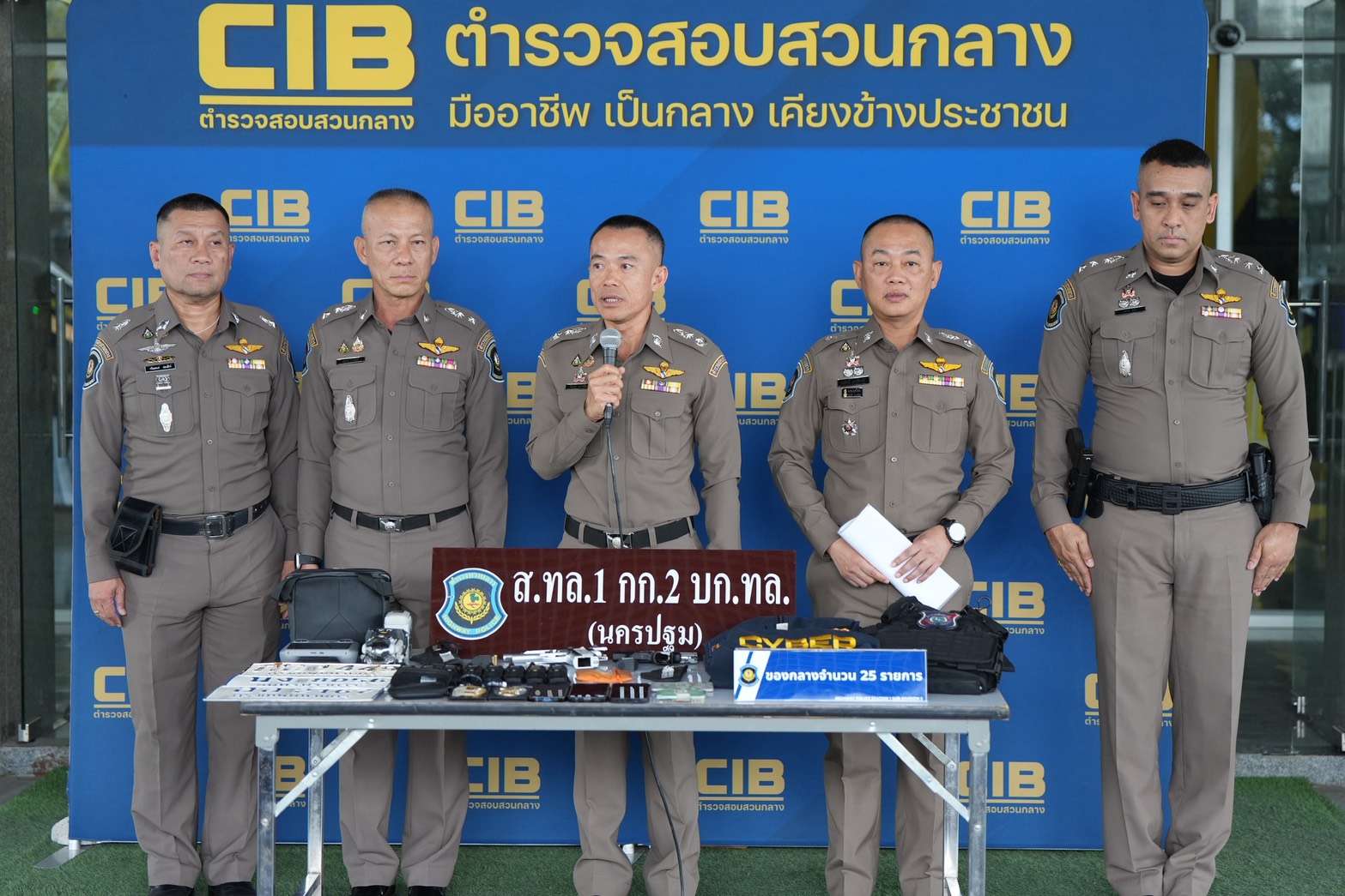 ขณะที่ พ.ต.อ.ภคพล เผยว่า นอกจากนี้ยังพบอุปกรณ์สวมรอยเจ้าหน้าที่จำนวนมาก มีทั้งโดรน DJI Mini 4 Pro วิทยุสื่อสารแบบใส่ซิม 8 เครื่อง เสื้อเกราะกันกระสุน เสื้อหน่วยงานตำรวจหลายสังกัด ป้ายห้อยคอสำนักงานตำรวจแห่งชาติ รวมถึงยาไอซ์ 1 ถุงเล็ก