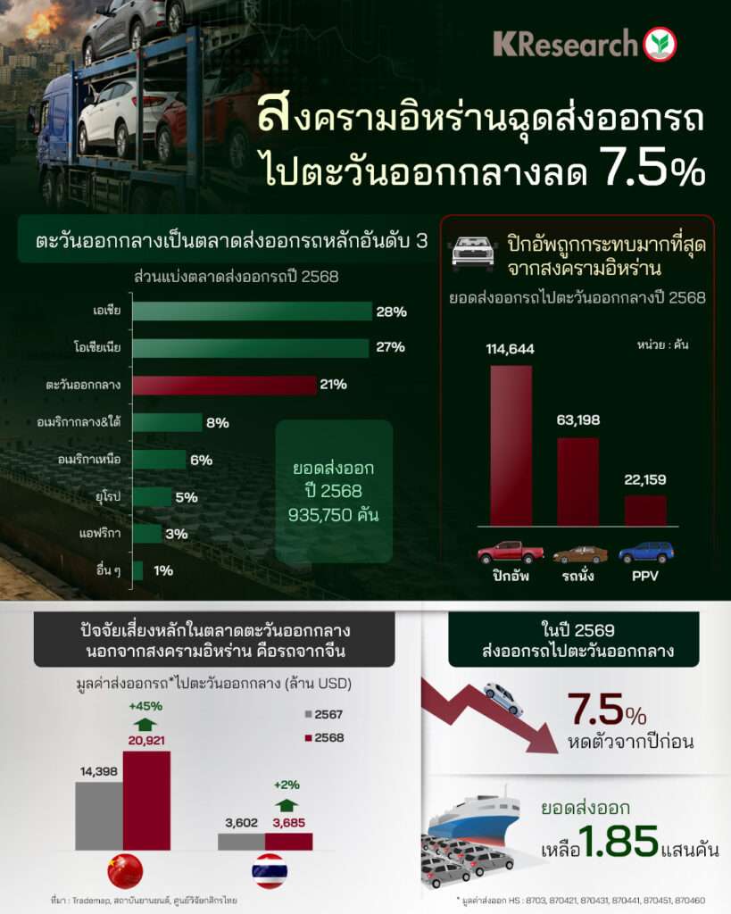 อย่างไรก็ตาม สำหรับทิศทางทั้งปี 2569 สงครามอิหร่านไม่ใช่ความเสี่ยงเดียวที่ไทยต้องเผชิญในการส่งออกรถยนต์ไปตะวันออกกลาง แต่รถยนต์ส่งมาจากจีนยังเป็นอีก 1 ปัจจัยเสี่ยงหลัก โดยในปีที่ผ่านมาจีนส่งออกไปตะวันออกกลางเพิ่มขึ้นถึง 45% ขณะที่ไทยส่งออกเพิ่มขึ้นเพียง 2% ศูนย์วิจัยกสิกรไทยจึงคาดว่าในปี 2569 การส่งออกรถยนต์ไทยไปตะวันออกกลางน่าจะหดตัว 7.5% จากปีก่อน เหลือยอดส่งออก 1.85 ล้านคัน จากปัจจัยเสี่ยงทั้ง 2 ด้านดังกล่าวข้างต้น