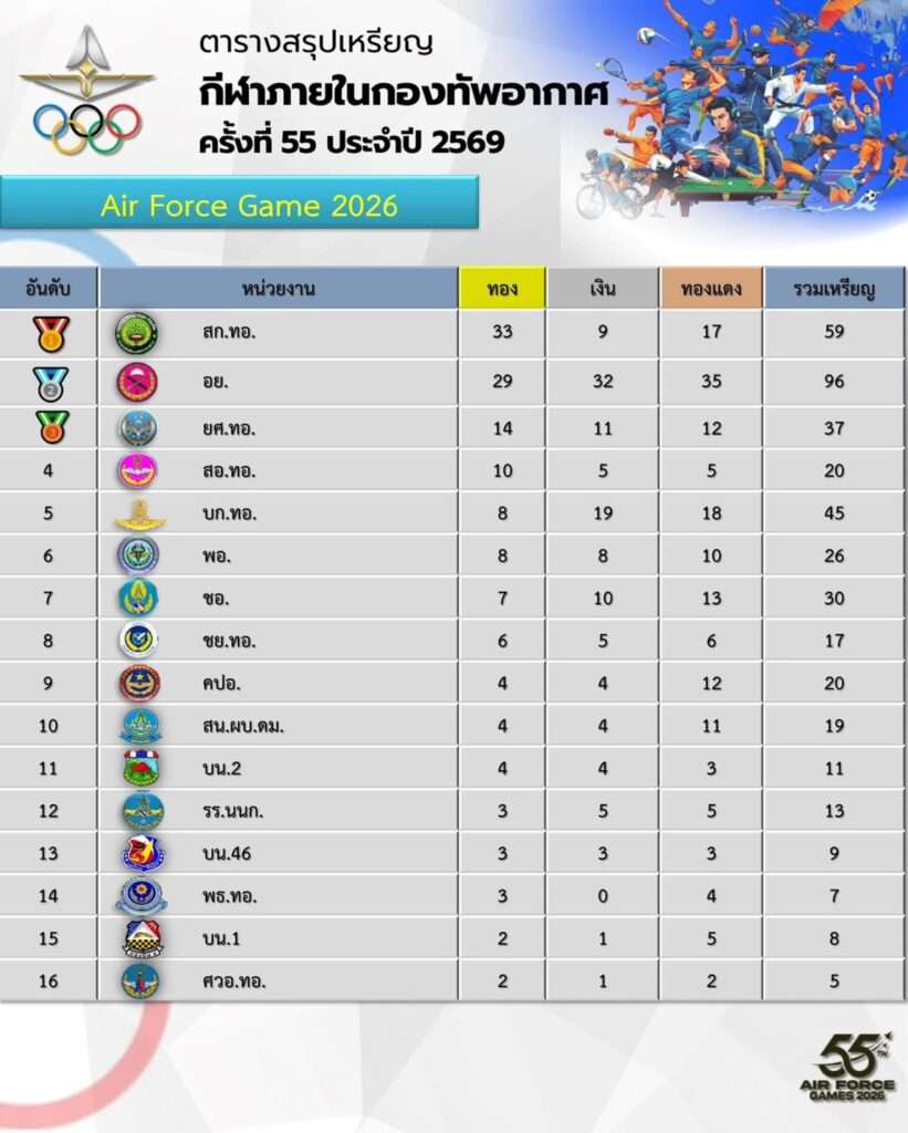 โดยสรุปผลการแข่งขันกีฬาภายในกองทัพอากาศ ครั้งที่ 55 ประจำปี 2569