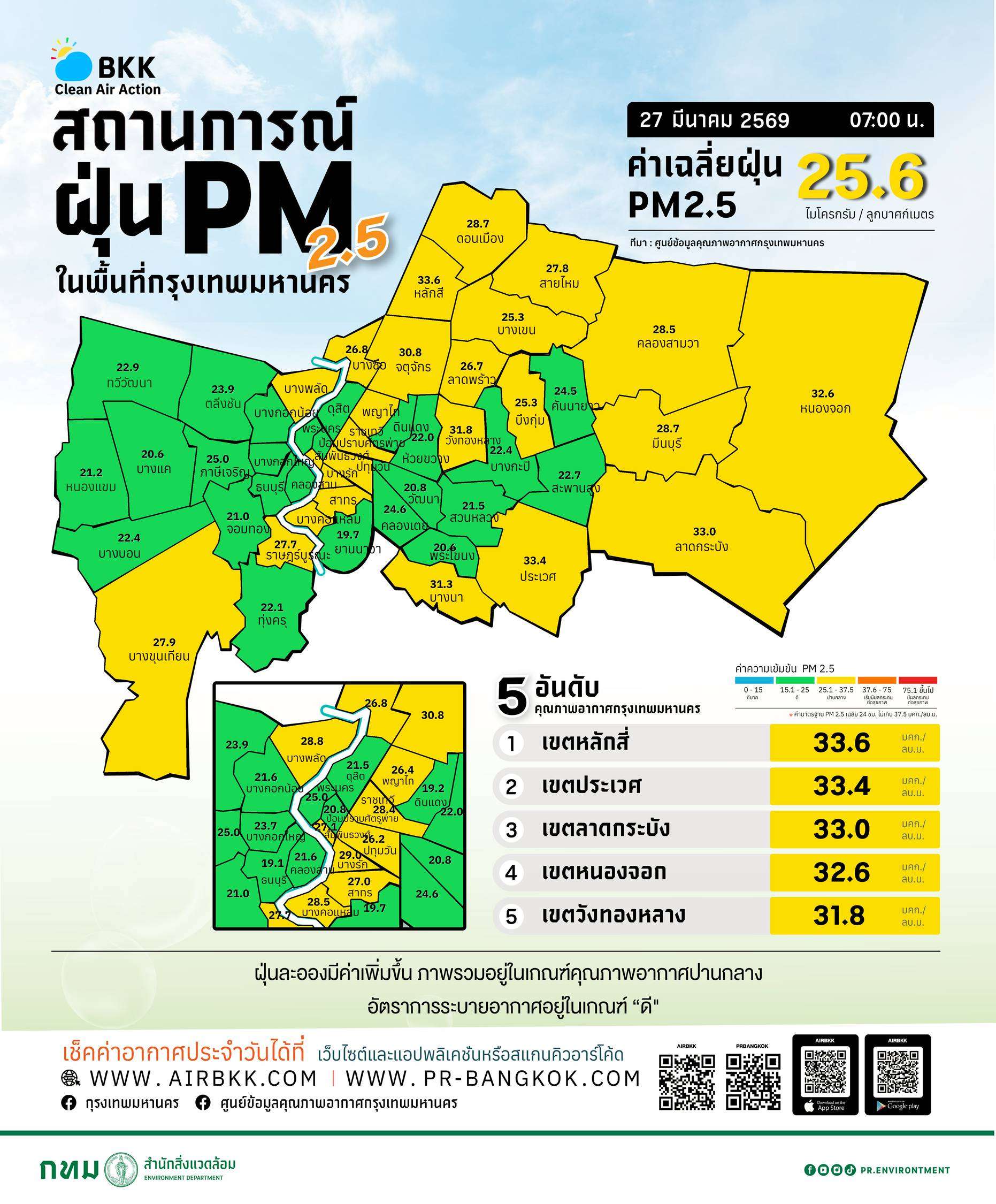 ศูนย์ข้อมูลคุณภาพอากาศกรุงเทพมหานคร รายงานสถานการณ์ฝุ่นละอองขนาดเล็กไม่เกิน 2.5 ไมครอน (PM2.5) ในพื้นที่กรุงเทพมหานคร ประจำวันที่ 27 มีนาคม 2569 เวลา 07.00 น. พบว่า ค่าเฉลี่ยฝุ่น PM2.5 ของทั้งกรุงเทพฯ อยู่ที่ 25.6 ไมโครกรัมต่อลูกบาศก์เมตร ซึ่งยังอยู่ต่ำกว่าค่ามาตรฐานที่กำหนดไม่เกิน 37.5 ไมโครกรัมต่อลูกบาศก์เมตร โดยภาพรวมคุณภาพอากาศอยู่ในเกณฑ์ปานกลาง อย่างไรก็ตาม แนวโน้มฝุ่นละอองเริ่มเพิ่มสูงขึ้นในหลายพื้นที่