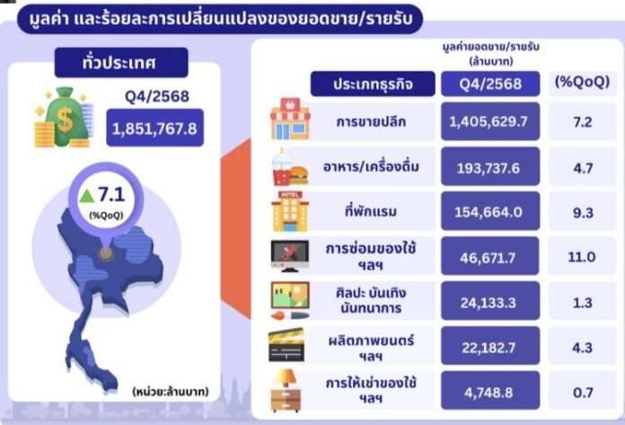 ภาพรวมของธุรกิจการขายปลีกสินค้าและการบริการทั่วประเทศ ในไตรมาส 4 ปี 2568 พบว่า มีมูลค่ารายรับเพิ่มขึ้นจากไตรมาส 3 ปี 2568 (%QoQ) ร้อยละ 7.1 โดยธุรกิจการซ่อมของใช้ส่วนบุคคลและของใช้ในครัวเรือน ฯลฯ  มีรายรับเพิ่มขึ้นมากที่สุด ร้อยละ 11.0  รองลงมาคือ ธุรกิจที่พักแรมและธุรกิจการขายปลีก มีรายรับเพิ่มขึ้น ร้อยละ 9.3และร้อยละ 7.2  ตามลำดับ
