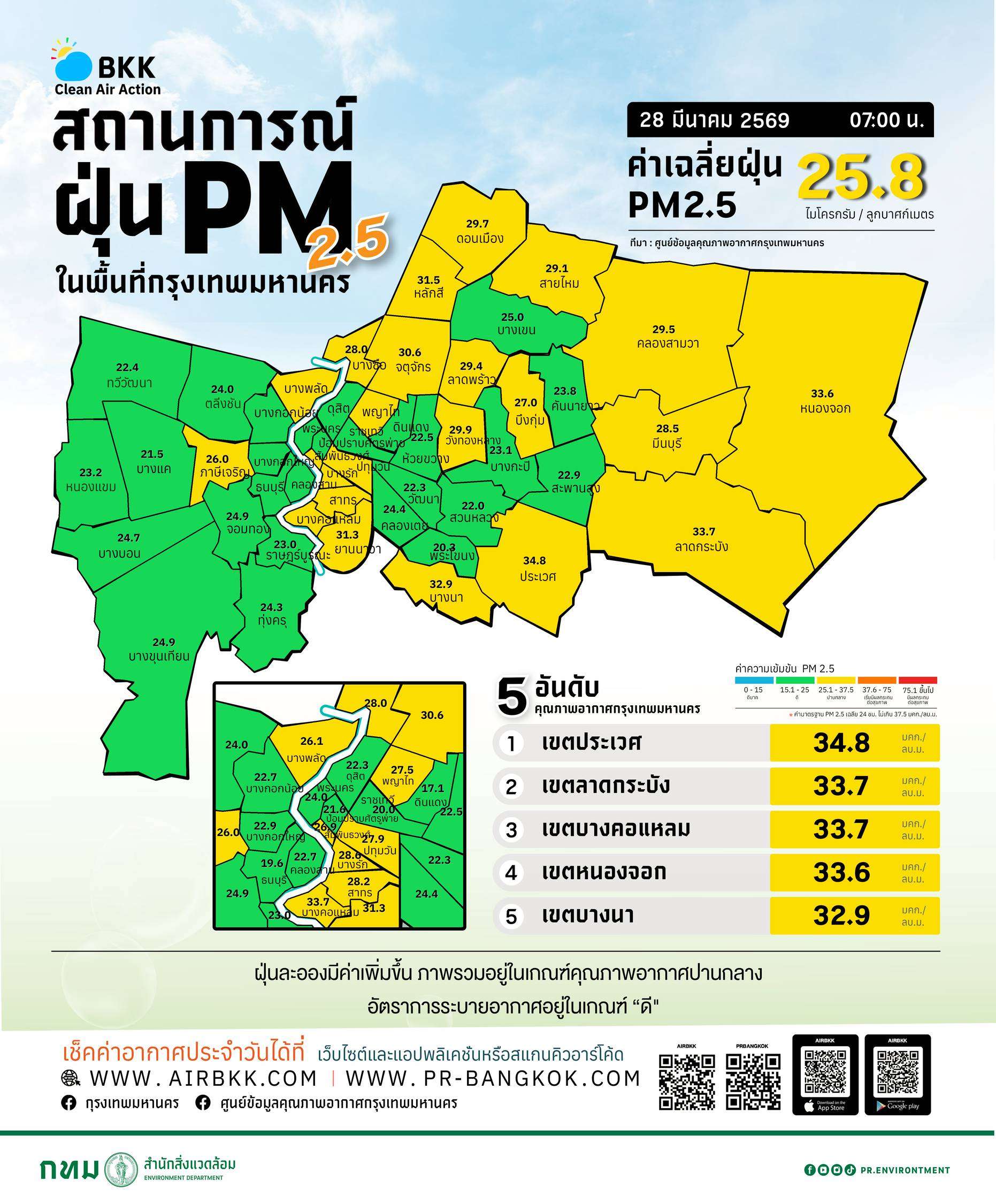 สถานการณ์ฝุ่นละอองขนาดเล็ก PM2.5 ในพื้นที่กรุงเทพมหานครเริ่มมีแนวโน้มเพิ่มสูงขึ้น โดยศูนย์ข้อมูลคุณภาพอากาศกรุงเทพมหานคร รายงานผลการตรวจวัดล่าสุดพบว่า ค่าเฉลี่ยฝุ่น PM2.5 ของทั้งเมืองอยู่ที่ 25.8 ไมโครกรัมต่อลูกบาศก์เมตร (มคก./ลบ.ม.) ซึ่งยังคงอยู่ต่ำกว่าค่ามาตรฐานที่กำหนดไว้ไม่เกิน 37.5 มคก./ลบ.ม. โดยภาพรวมคุณภาพอากาศอยู่ในระดับปานกลาง