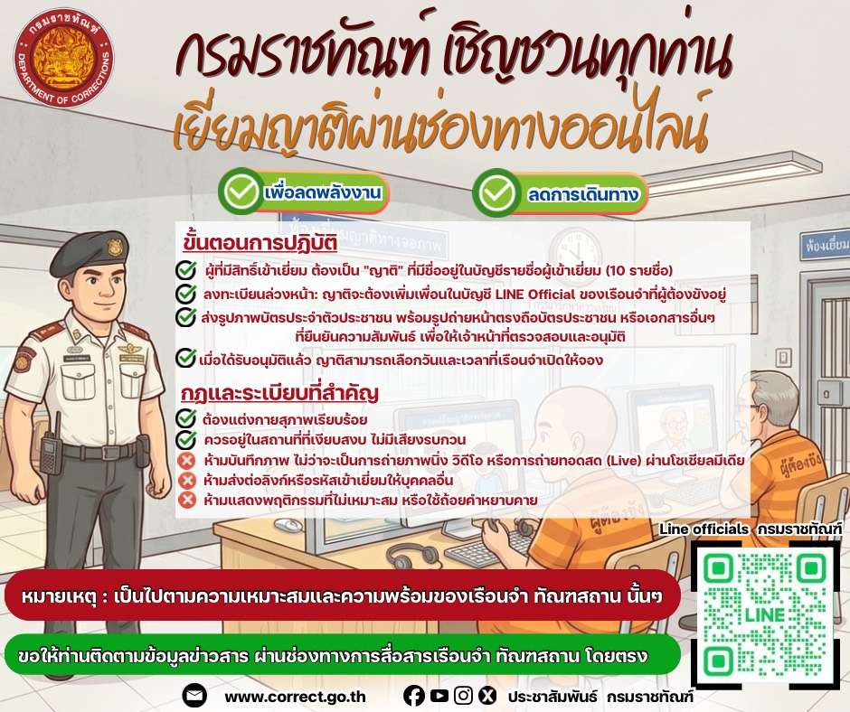 กรมราชทัณฑ์ ซึ่งมีภารกิจสำคัญในการควบคุม ดูแล และพัฒนาพฤตินิสัยผู้ต้องขังให้มี ความพร้อมในการกลับคืนสู่สังคมอย่างมีคุณภาพ ได้เล็งเห็นถึงความสำคัญของการอำนวยความสะดวกแก่ญาติผู้ต้องขัง ควบคู่กับการลดการใช้พลังงาน จึงส่งเสริมการเยี่ยมญาติผ่านแอปพลิเคชัน LINE ซึ่งเป็นอีกหนึ่งทางเลือกที่สะดวก รวดเร็ว และปลอดภัย ซึ่งการเยี่ยมผ่านระบบออนไลน์ดังกล่าว ไม่เพียงช่วยลดภาระค่าใช้จ่ายในการเดินทางของญาติผู้ต้องขัง แต่ยังช่วยลดการใช้น้ำมันเชื้อเพลิง ลดการปล่อยพลังงาน และมีส่วนร่วมในการสนับสนุนมาตรการประหยัดพลังงานของประเทศ อีกทั้งยังคงสามารถส่งต่อความรัก ความห่วงใยถึงผู้ต้องขังได้อย่างต่อเนื่อง