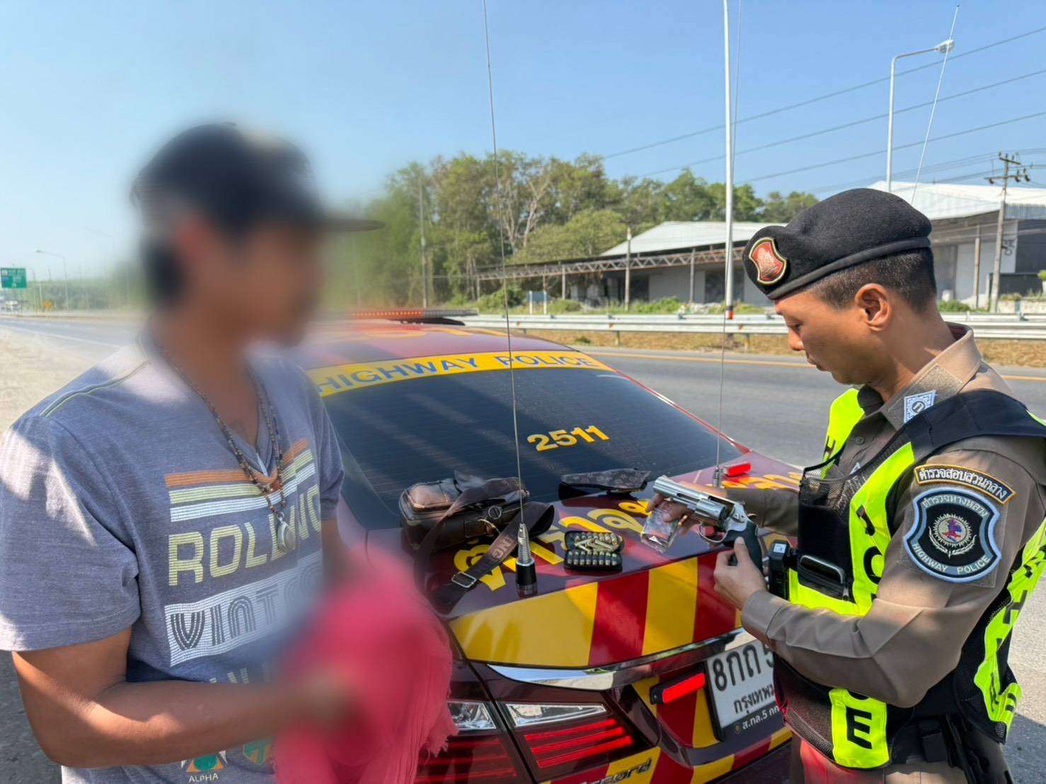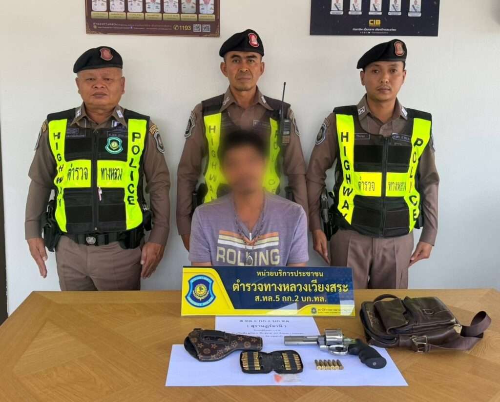 พร้อมของกลางอาวุธปืนสั้น ขนาด .357 1 กระบอก กระสุนปืน 21 นัด และยาบ้าอีก 11 เม็ด ได้บนถนนทางหลวงหมายเลข 41 กม.240 (ขาขึ้น) ม.5 ต.คลองฉนวน อ.เวียงสระ จ.สุราษฎร์ธานี