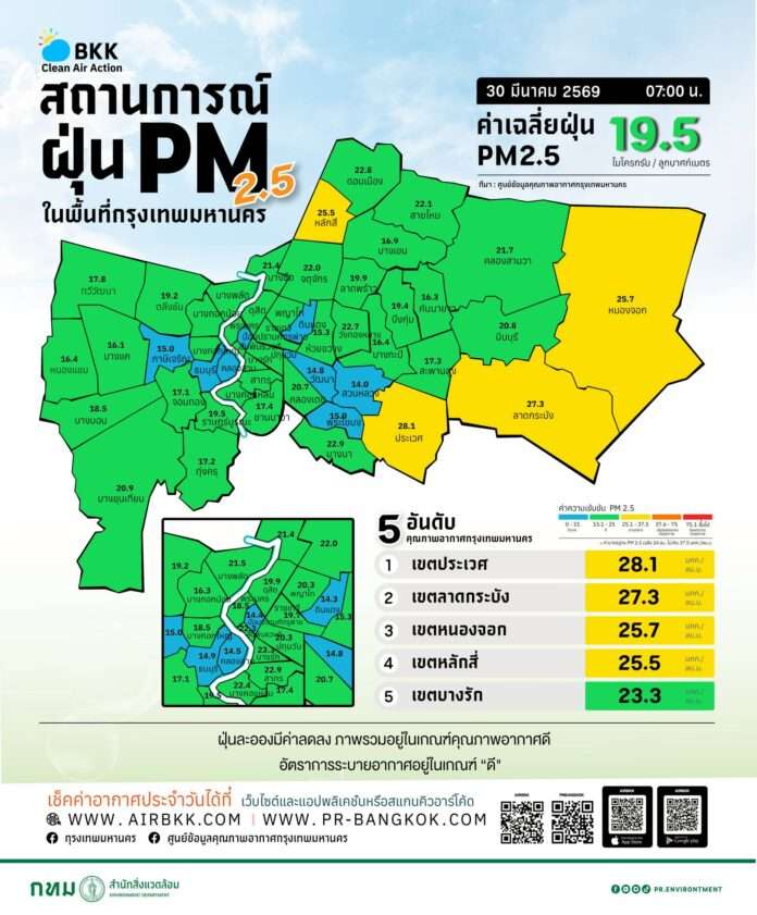 ศูนย์ข้อมูลคุณภาพอากาศกรุงเทพมหานคร รายงานสถานการณ์ฝุ่นละอองขนาดไม่เกิน 2.5 ไมครอน (PM2.5) ในพื้นที่กรุงเทพมหานคร ประจำวันที่ 30 มีนาคม 2569 เวลา 07.00 น. พบว่า ค่าเฉลี่ยของทั้งกรุงเทพฯ อยู่ที่ 19.5 ไมโครกรัมต่อลูกบาศก์เมตร ซึ่งยังอยู่ต่ำกว่าค่ามาตรฐานที่กำหนดไม่เกิน 37.5 ไมโครกรัมต่อลูกบาศก์เมตร สะท้อนภาพรวมคุณภาพอากาศอยู่ในเกณฑ์ดี