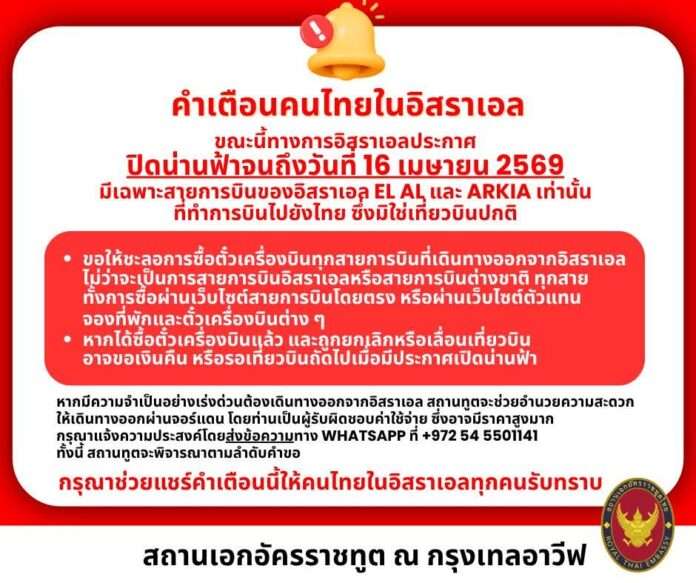 สถานเอกอัครราชทูตไทย ณ กรุงเทลอาวีฟ เตือนคนไทยในอิสราเอล หลังทางการอิสราเอลประกาศปิดน่านฟ้าถึง 16 เม.ย. 69