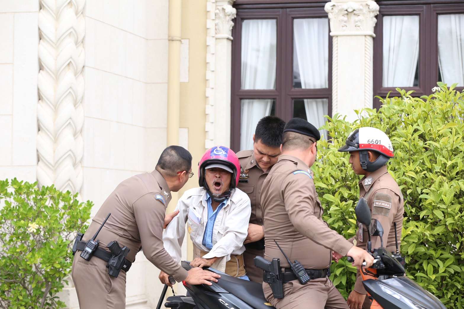 ชายสูงอายุ ขี่มอเตอร์ไซค์ติดสติกเกอร์คนพิการฝ่าจุดตรวจทำเนียบรัฐบาล บีบแตร – ตะโกนเรียกหา “อนุทิน” ขึ้นไปจอดหน้าตึกไทยคู่ฟ้า อ้างไม่ได้รับความเป็นธรรม – ขอเงินเยียวยา ก่อนถูกตำรวจสันติบาล ประกบพาออกนอกพื้นที่