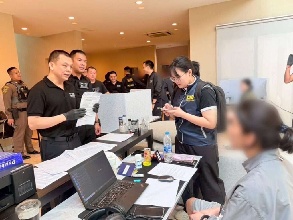 ด้าน พล.ต.ต.ชนันนัทธ์ กล่าวว่า จากการตรวจค้นพบว่าภายในบ้านถูกดัดแปลงเป็นลักษณะออฟฟิศคอลเซ็นเตอร์โดยมีการจัดโต๊ะทำงานจำนวน 11 จุด พร้อมอุปกรณ์โทรศัพท์VoIP, อุปกรณ์กระจายสัญญาณอินเทอร์เน็ต (Router), เครื่องคอมพิวเตอร์ตั้งโต๊ะเปิดหน้าจอค้างอยู่ ซึ่งมีการแสดงผลเป็นข้อความบทสคริปต์, เอกสารสคริปต์วางอยู่ที่โต๊ะ สำหรับพูดหรือพิมพ์เพื่อใช้ในการหลอกลวงทางออนไลน์, รายชื่อเหยื่อชาวเกาหลีใต้พร้อมหมายเลขโทรศัพท์และเอกสารปลอมแอบอ้างเป็นหนังสือทาง
