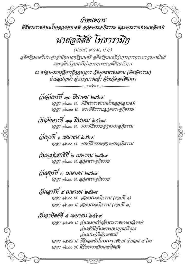วันที่ 30 มี.ค.2569 ผู้สื่อข่าวรายงาน ว่า นายพิชญ์ โพธารามิก ลูกชายของ นายอดิศัย โพธารามิก อดีตรัฐมนตรีว่าการกระทรวงศึกษาธิการ (ศธ.) โพสต์ข้อความผ่านเฟซบุ๊ก Pete Bodharamik ใจความว่า 7.28 am : 28 มีนาคม 2569 คุณพ่อ จากไป อย่างสงบ ทุกคำสอน ทุกคำสั่งเสีย จะนำไปดำเนินการ ให้เรียบร้อยครับ พร้อมกับแนบกำหนดการ พีธีพระราชทานน้ำหลวงอาบศพ