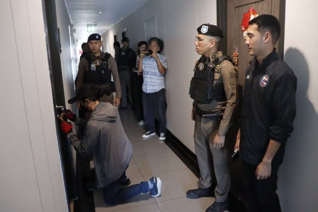 พล.ต.ต.พัฒนศักดิ์ บุบผาสุวรรณ ผบก.ป. พ.ต.อ.อนุสรณ์ ทองไสย รรท.ผกก.6 บก.ป. พ.ต.ท.วชิระ ศุภพิสิษฐ์กุล รอง ผกก.6 บก.ป. พ.ต.ท.กิติภูมิ ศรีแผ้ว รอง ผกก.6 บก.ป. พ.ต.ท.เกียรติศักดิ์ บุญทอง สว.กก.6 บก.ป. พ.ต.ท.ธนาคาร อุชณรัศมี สว.กก.6 บก.ป. และ พ.ต.ท.จอมพฤทธิ์ แก้วเรือง สว.กก.6 บก.ป.พร้อมด้วยเจ้าหน้าที่ สสน.บก.ป. ,บก.ปอท.และ ศูนย์ต่อต้านการฉ้อโกงออนไลน์ นำหมายศาลอาญารัชดาฯ เข้าตรวจค้นคอนโดมิเนียม ASHER Ratchada เลขที่ 12 ซ.20 มิถุนา แยก 5 แขวงสามเสนนอก เขตห้วงขวาง กทม.และ คอนโดมิเนียมโครงการชีวาทัย ฮอลล์ ลาดพร้าวโชคชัย 4 เลขที่ 959 ถ.สังคมสงเคราะ แขวงสะพานสอง เขตวังทองหลาง กทม. หลังสืบทราบว่าเป็นสถานที่ที่แก๊งคอลเซ็นเตอร์เช่าไว้ติดตั้งเครื่องซิมบ็อกซ์ (SIM BOX ) เพื่อใช้ในการหลอกลวงประชาชน โดยได้แจ้งให้ผู้ดูแลคอนโดฯ ทราบ พร้อมทั้งยินยอมให้เจ้าหน้าที่ตำรวจทำการตรวจค้น