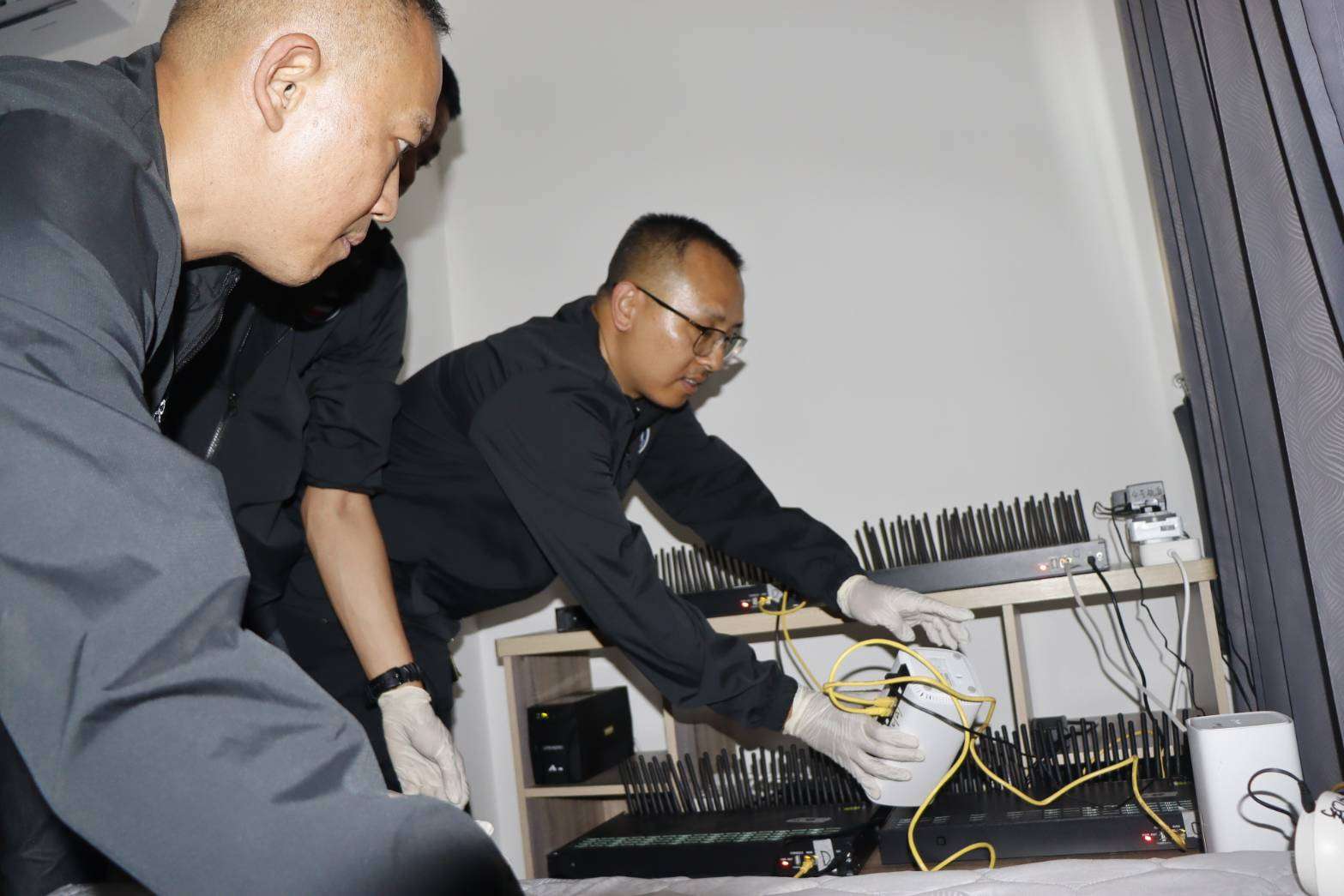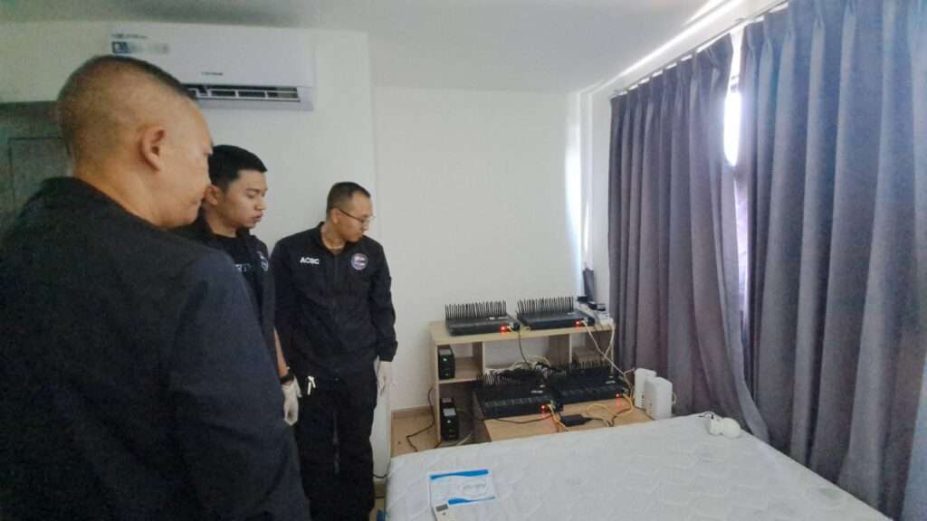 จากการตรวจสอบพบห้องดังกล่าวเปิดแอร์ ไว้ตลอดเวลา โดยไม่มีคนเข้าพักอาศัยอยู่ จากการตรวจสอบพบเครื่องซิมบ็อกห้องละ 4 เครื่องรวม 8 เครื่อง โดยแต่ละเครื่อง บรรจุซิมได้ 32 ซิม, กล้องวงจรปิด 2 ตัว ,
