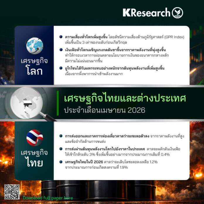กรุงเทพฯ, วันที่ 3 เม.ย. ศูนย์วิจัยกสิกรไทย รายงานภาวะเศรษฐกิจไทย และต่างประเทศ ประจำเดือนเมษายน ว่า ในส่วน เศรษฐกิจโลก มีความเสี่ยงเพิ่มสูงขึ้น โดยดัชนีความเสี่ยงด้านภูมิรัฐศาสตร์ (GPR Index) เพิ่มขึ้นเป็น 3 เท่าของระดับก่อนเกิดวิกฤต ขณะที่เงินเฟ้อทั่วโลกเผชิญแรงกดดันขาขึ้นจากราคาพลังงานที่พุ่งสูงขึ้น ทำให้กรอบเวลาการผ่อนคลายนโยบายการเงินของธนาคารกลางหลักมีความไม่แน่นอนมากขึ้น โดยเฉพาะยูโรโซนได้รับผลกระทบอย่างหนักจากต้นทุนพลังงานที่เพิ่มสูงขึ้น เนื่องจากพึ่งพาการนำเข้าพลังงานมาก