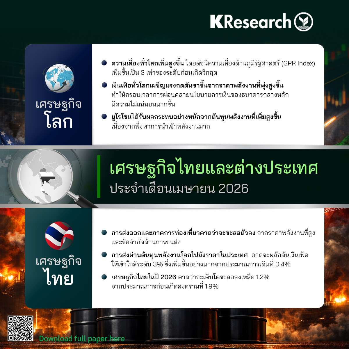 ศูนย์วิจัยกสิกรไทย ชี้ ศก.โลกเสี่ยงสูง ยุโรปกระทบหนักเหตุพึ่งพานำเข้าพลังงานมาก คาด ศก.ไทยปี 69 โตแค่ 1.2%