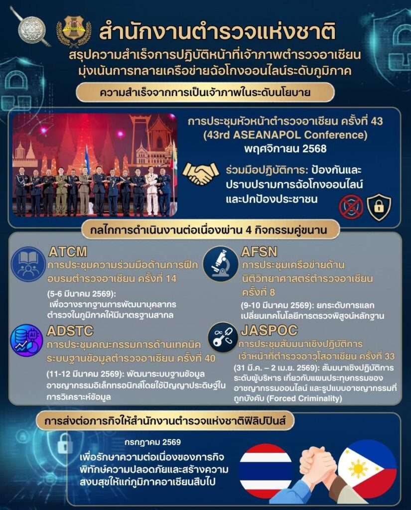 ประเทศไทยได้เริ่มต้นบทบาทเจ้าภาพอย่างเป็นทางการในการประชุมหัวหน้าตำรวจอาเซียน ครั้งที่ 43 (43rd ASEANAPOL Conference) เมื่อเดือนพฤศจิกายน 2568 ภายใต้หัวข้อหลัก “ร่วมมือปฏิบัติการ : ปราบปรามการหลอกลวง ขัดขวางการฉ้อโกง และปกป้องประชาชน” (Collaboration in Action : Crushing Scam, Disrupting Fraud, and Protecting People) โดยมีผู้แทนจาก 33 ประเทศ ประกอบด้วย สมาชิกอาเซียน 10 ประเทศ ประเทศคู่เจรจา 11 ประเทศ และประเทศผู้สังเกตการณ์ 12 ประเทศ ร่วมกันวางแนวทางป้องกันและปราบปรามการฉ้อโกงออนไลน์ ซึ่งเป็นวาระเร่งด่วนระดับสากล นอกจากนี้ ยังมี พ.ต.อ.ก ้องกฤษฎา กิตติถิระพงษ์ ข้าราชการตำรวจไทย ปฏิบัติหน้าที่ผู้อำนวยการบริหาร สำนักงานเลขาธิการตำรวจอาเซียน เข้าร่วมการประชุมต่าง ๆ ในบทบาทดังกล่าว