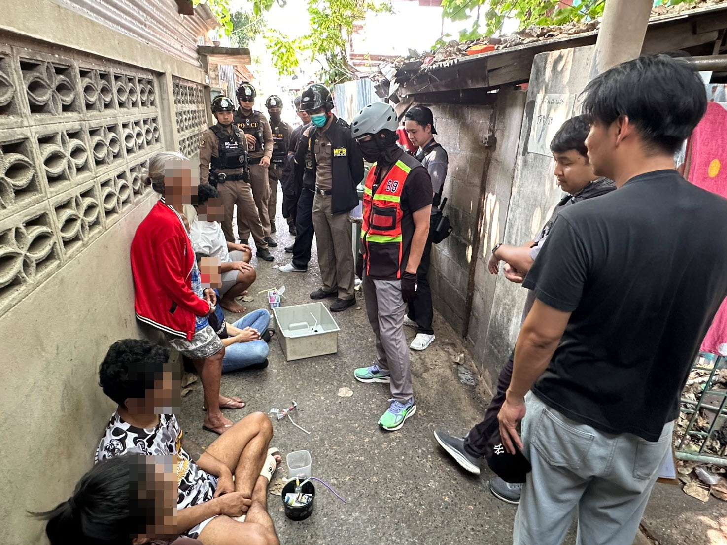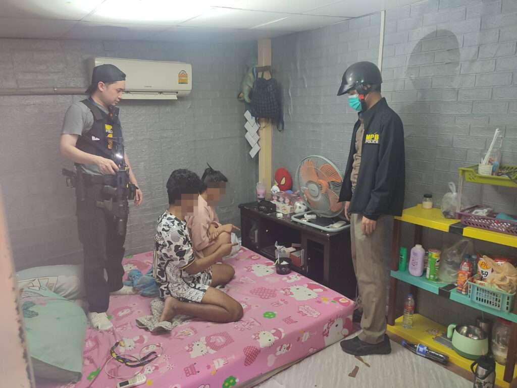 จากการสืบสวนพบว่า ผู้ต้องหารายดังกล่าวเมื่ออยู่ในอาการมึนเมายาเสพติด มักก่อเหตุทำร้ายร่างกายภรรยา อีกทั้งยังเคยข่มขู่บุคคลในครอบครัว และมีพฤติกรรมใช้อาวุธมีดข่มขู่หญิงสาวในลักษณะคุกคามทางเพศ สร้างความหวาดกลัวให้กับคนในชุมชนมาอย่างต่อเนื่องภายหลังรวบรวมพยานหลักฐาน เจ้าหน้าที่ได้ขออนุมัติหมายค้นจากศาล ก่อนนำกำลังเข้าตรวจค้นตามแผนยุทธการ พบผู้ต้องหาหลายรายอยู่ภายในบ้านในสภาพมึนเมาจากยาเสพติด สามารถจับกุมผู้ต้องหาได้รวม 6 ราย ได้แก่ นายศรครินทร์ อายุ 24 ปี, น.ส.แก้วมณี อายุ 23 ปี พร้อมของกลางเคตามีนและพอตบุหรี่ไฟฟ้า, นายพิชนุ หรือ “โบ้” อายุ 26 ปี รับว่าเสพยาไอซ์และสมัครใจเข้ารับการบำบัด, น.ส.วริษา อายุ 39 ปี และ น.ส.นภษร อายุ 46 ปี รับว่าเสพยาและสมัครใจเข้ารับการบำบัด รวมถึง นางวาสนา อายุ 67 ปี พร้อมของกลางยาไอซ์น้ำหนักประมาณ 0.2 กรัม