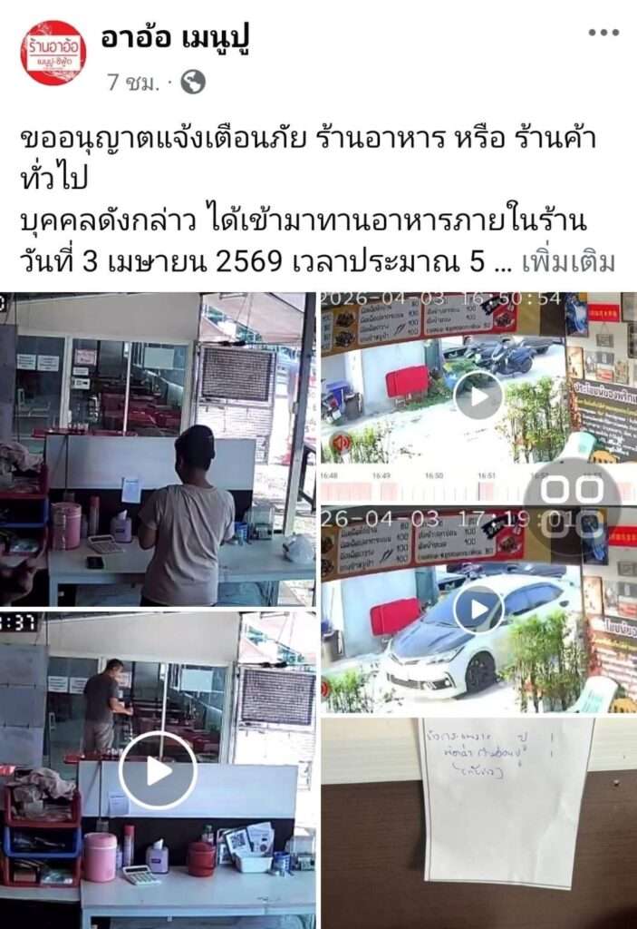 เตือนภัยร้านอาหาร! ลูกค้าแต่งตัวภูมิฐานสั่ง “กะเพราปู–ผัดฉ่าก้ามอ่อน” กินหมดเกลี้ยง มูลค่าเกือบ 400 บาท ก่อนทำทีคุยโทรศัพท์เดินออกจากร้าน ขับรถหนีไม่จ่ายเงิน เจ้าของร้านโพสต์กล้องวงจรปิดตามตัว พร้อมฝากเตือนผู้ประกอบการระวังพฤติกรรมแฝง จากกรณีผู้ใช้เฟซบุ๊ก