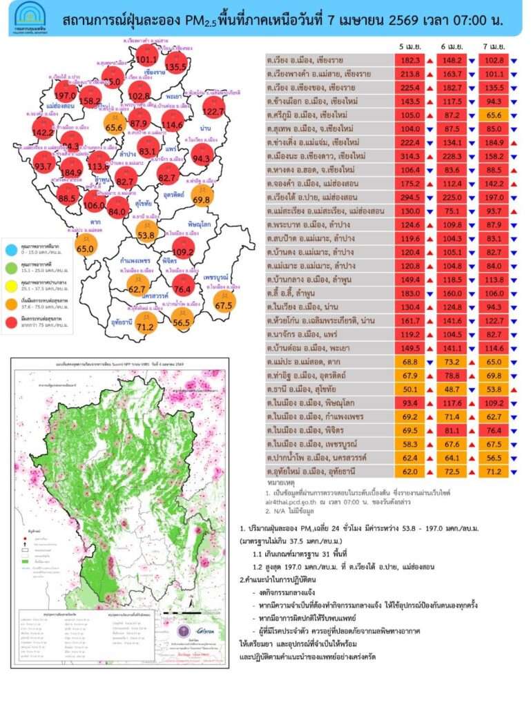 กรุงเทพฯ, วันที่ 7 เมษายน – ศูนย์สื่อสารการแก้ไขปัญหามลพิษทางอากาศ (ศกพ.) กรมควบคุมมลพิษ รายงานการติดตามตรวจสอบคุณภาพอากาศประจำวัน ณ 07:00 น ภาพรวมปริมาณ PM2.5 ในประเทศพบเกินค่ามาตรฐานใน จ.นนทบุรี กรุงเทพฯ สมุทรปราการ เชียงราย เชียงใหม่ น่าน แม่ฮ่องสอน พะเยา ลำพูน ลำปาง แพร่ อุตรดิตถ์ สุโขทัย พิษณุโลก ตาก กำแพงเพชร พิจิตร เพชรบูรณ์ นครสวรรค์ อุทัยธานี ชัยนาท สิงห์บุรี ลพบุรี สระบุรี อ่างทอง สุพรรณบุรี พระนครศรีอยุธยา ราชบุรี สมุทรสงคราม เพชรบุรี บึงกาฬ หนองคาย เลย อุดรธานี นครพนม หนองบัวลำภู สกลนคร มุกดาหาร ขอนแก่น กาฬสินธุ์ มหาสารคาม ร้อยเอ็ด อำนาจเจริญ ชัยภูมิ และ อุบลราชธานี
