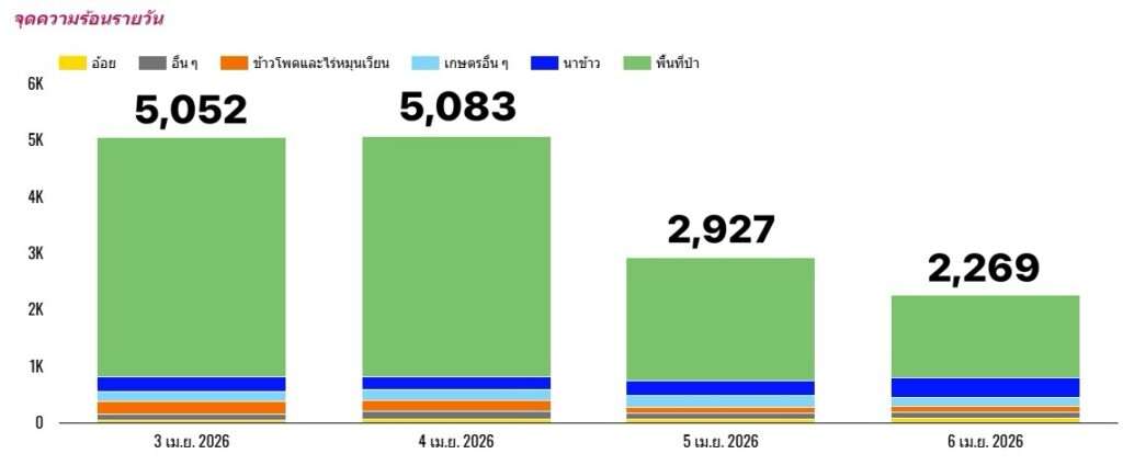 ข้อมูลจุดความร้อน ณ วันที่ 6 เมษายน 2569 พบว่า ประเทศไทยพบจุดความร้อนทั้งสิ้น 2,269 จุด ส่วนใหญ่พบในพื้นที่ป่ากว่า 1,470 จุด คิดเป็นร้อยละ 65 จังหวัดที่พบจุดความร้อนสูงสุดได้แก่ กาญจนบุรี ชัยภูมิแม่ฮ่องสอน ตาก และลำปาง ตามลำดับ