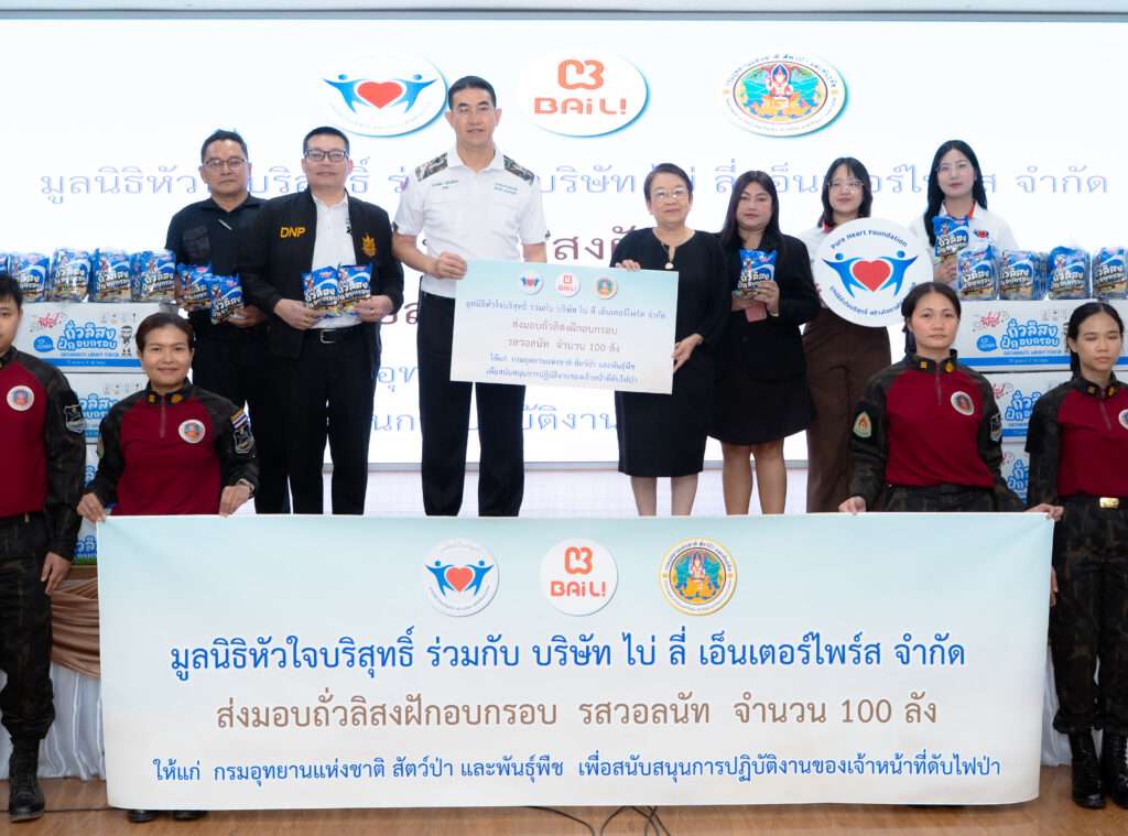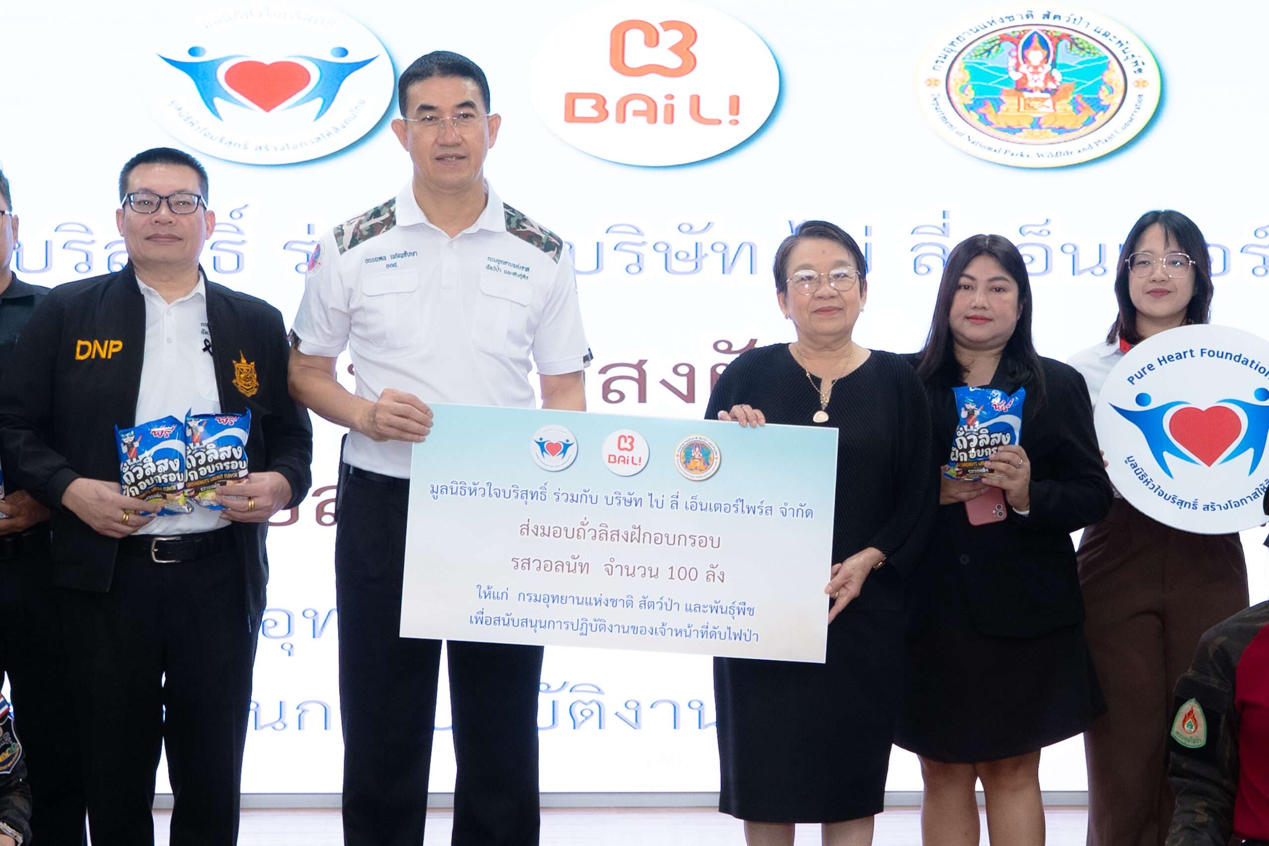 กรมอุทยานแห่งชาติ สัตว์ป่า และพันธุ์พืช (อช.), วันที่ 7 เมษายน 2569 นางเธียรรัตน์ นะวะมะวัฒน์ ประธานมูลนิธิหัวใจบริสุทธิ์ พร้อมทีมงาน ร่วมกับ จ.ส.อ.หญิงวรรณภา ปานสุข ผู้ช่วยผู้บริหาร บริษัท ไบ่ ลี่ เอ็นเตอร์ไพร์ส จำกัด มอบขนมถั่วลิสงฝักอบกรอบ รสวอลนัท จำนวน 100 ลัง (3,600 ชิ้น) มูลค่ารวม 90,000 บาท ซึ่งได้รับการสนับสนุนจาก คุณสราญจิตร หวัง กรรมการบริษัท บริษัท ไบ่ ลี่ เอ็นเตอร์ไพร์ส จำกัด โดยมีนายอรรถพล เจริญชันษา อธิบดี อช. เป็นผู้แทนรับมอบ
