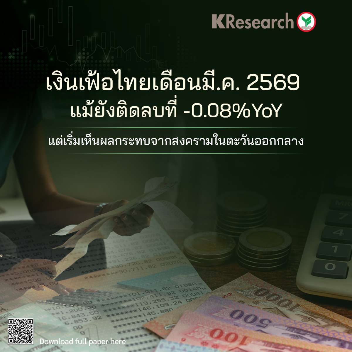 กรุงเทพฯฅ, วันที่ 8 เม.ย. ศูนย์วิจัยกสิกรไทย เผย อัตราเงินเฟ้อไทยในเดือนมี.ค. 2569 ยังติดลบอยู่ที่ -0.08% จากราคาพลังงานในประเทศเฉลี่ยที่ยังต่ำกว่าปีก่อนหน้า ขณะที่เริ่มเห็นราคาสินค้าบางรายการปรับตัวขึ้นหลังได้รับผลกระทบจากตะวันออกกลาง อาทิ วัสดุก่อสร้าง และค่าขนส่งสาธารณะ
