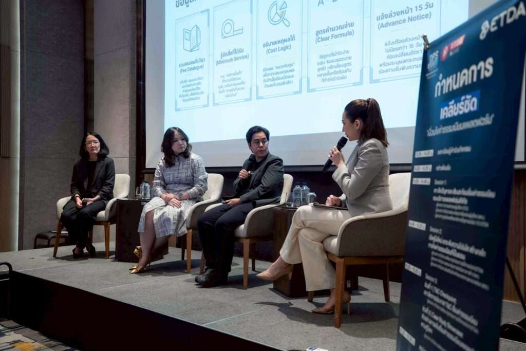 นอกจากนี้ ภายในงานยังเปิดเวทีแลกเปลี่ยนในหลากหลายมิติที่เกี่ยวข้อง จากหลากหลายหน่วยงาน อาทิ สภาองค์กรของผู้บริโภค (TCC), สำนักงานคณะกรรมการคุ้มครองผู้บริโภค (สคบ.), ศูนย์ช่วยเหลือและจัดการปัญหาออนไลน์ (1212 ETDA) และ ทีมนโยบายและเกณฑ์การกำกับดูแล ของ ETDA ที่มาร่วมถ่ายทอดมุมมองและประสบการณ์จริงเกี่ยวกับค่าธรรมเนียมแพลตฟอร์ม เพื่อเปิดภาพให้เห็นทั้งมุมผู้กำกับดูแล ผู้ประกอบการ และผู้บริโภคอย่างรอบด้าน โดยเนื้อหาครอบคลุมตั้งแต่การสะท้อนผลกระทบจริงจากผู้ใช้งาน การวิเคราะห์ประเด็นเชิงนโยบาย ไปจนถึงการอธิบายแนวทางและตัวอย่างการกำหนดค่าธรรมเนียมที่เหมาะสม เพื่อให้สามารถนำไปปรับใช้ได้จริงในทางปฏิบัติ และขยายผลสู่มาตรฐานในวงกว้าง