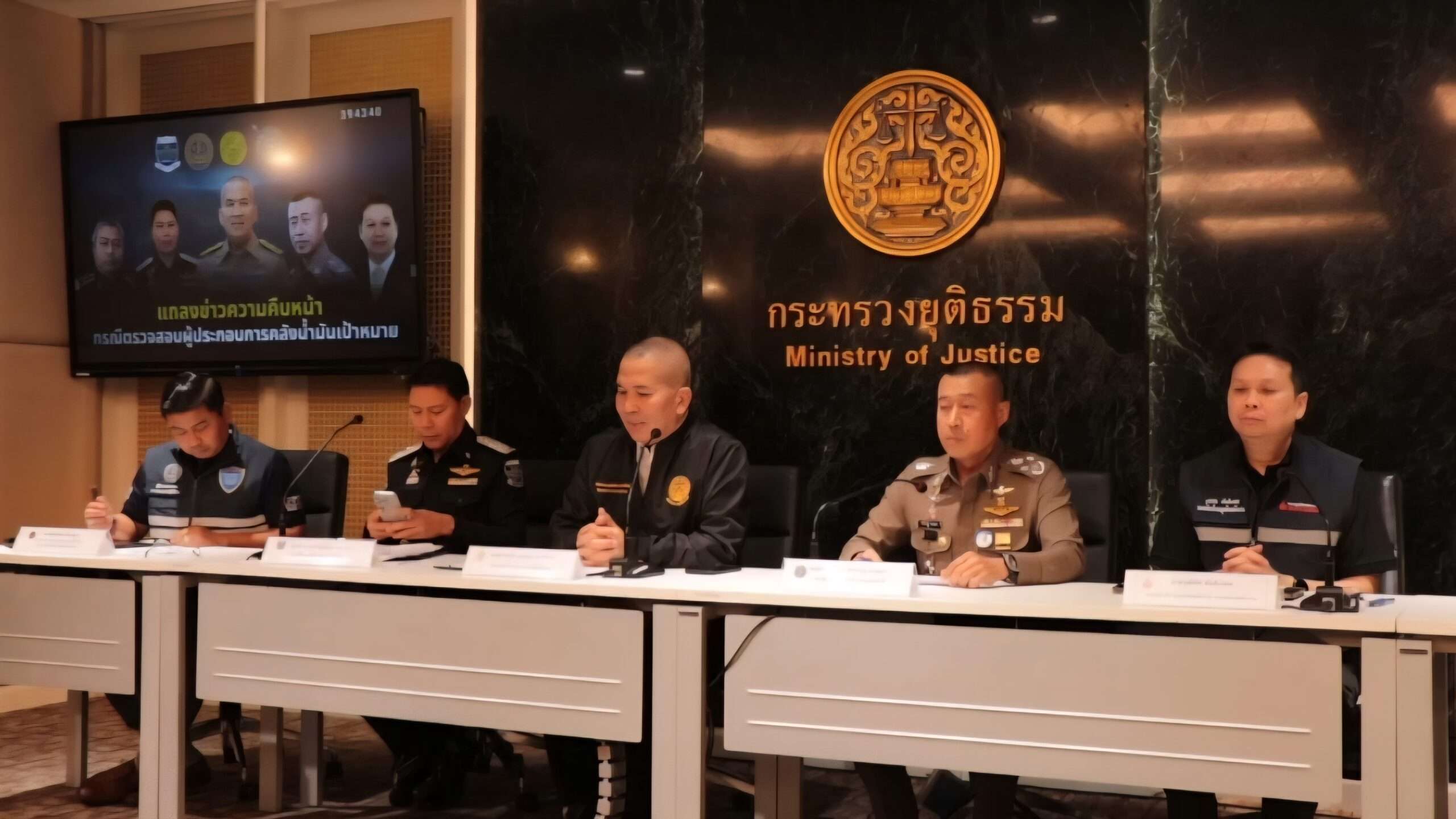 เมื่อเวลา 14.00 น. วันที่ 8 เม.ย. ที่ ห้องรับรอง ชั้น 2 อาคารกระทรวงยุติธรรม ถนนแจ้งวัฒนะ กรุงเทพฯ พล.ต.ท.รุทธพล เนาวรัตน์ รมว.ยุติธรรม พร้อมด้วย พ.ต.ต.ยุทธนา แพรดำ อธิบดีดีเอสไอ พล.ต.อ.สำราญ นวลมา รอง ผบ.ตร. นายสมชาย รัตนสุภา ผอ.กองตรวจสอบและปฏิบัติการ กรมการค้าภายใน กระทรวงพาณิชย์ นายวุฒิทัต ตันติเวสส รองอธิบดีกรมธุรกิจพลังงาน กระทรวงพลังงาน ร่วมกันแถลงผลการเปิดปฏิบัติการสืบสวนสอบสวนคดีการกักตุนน้ำมัน หลังเช้าวันนี้เปิดปฏิบัติการตรวจสอบพื้นที่เป้าหมาย 4 จุด ซึ่งเป็นโรงกลั่นน้ำมันขนาดย่อยและบริษัทคลังน้ำมัน ในจังหวัดสมุทรสาคร จังหวัดระยอง จังหวัดปทุมธานี และจังหวัดพระนครศรีอยุธยา
