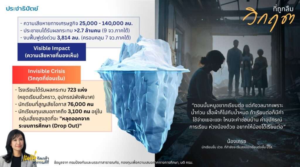 “รัดเกล้า” เปิดสถิติสุดช็อก น้ำท่วมหาดใหญ่ ทำ 700 รร.พัง นักเรียน 7 หมื่น เคว้ง ชี้ “วิกฤตที่ถูกลืม” กระทบอนาคตเด็กไทย แฉรัฐบาลเยียวยาเหลื่อมล้ำ แจกครัวเรือนแต่ลืมโรงเรียน ชี้ต้องมีงบฉุกเฉินระดับโรงเรียน “น้ำท่วมจบได้ แต่อย่าให้อนาคตเด็กจบไปด้วย”