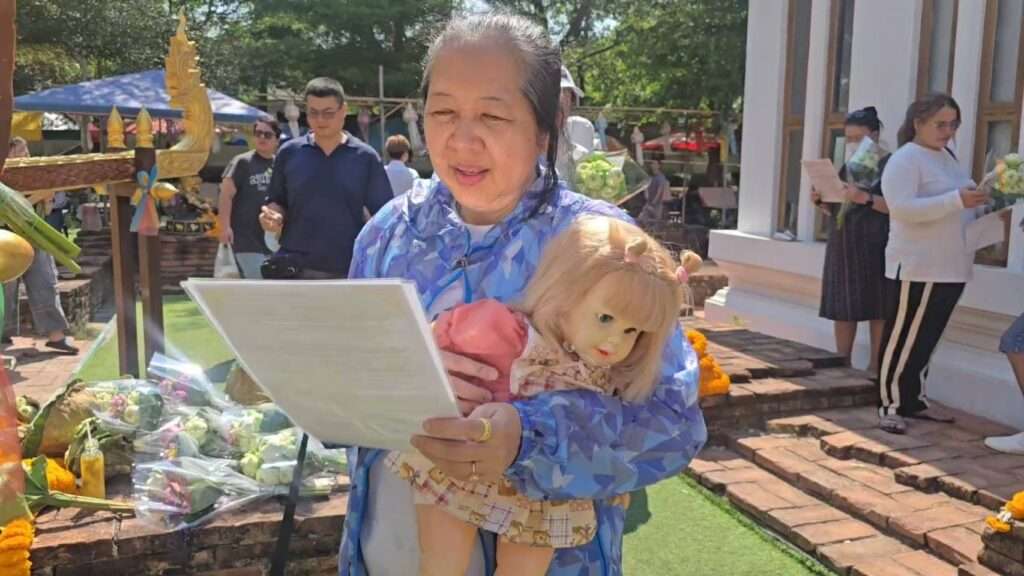 ขณะที่คุณป้าเล็ก ที่มาทำบุญซื้อช่อดอกบัวถวาย โดยอุ้มตุ๊กตาเทพตัวใหญ่ชื่อ “น้องมะลิ” ก็กล่าวสั้น ๆ ว่า ตนมาขอพรประจำในเรื่องของสุขภาพ และก็สมปรารถนาทุกครั้งที่ว่าง ก็จะมาทำบุญและซื้อ ดอกบัวถวายองค์หลวงพ่อดำ กับเจดีย์พระปรางค์เสมอมา