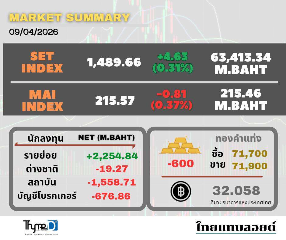 ตลาดหุ้นไทยปิดวันนี้ที่ระดับ 1,489.66 จุด บวก 4.63 จุด (+0.31%) มูลค่าซื้อขาย 63,413.34 ล้านบาท