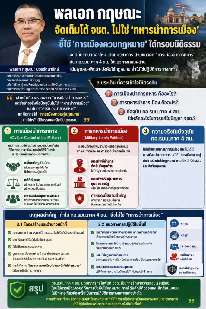 อดีตที่ปรึกษากลาโหมเปิดมุมวิชาการ สวนแนวคิด “การเมืองนำการทหาร” ยัน กอ.รมน.ภาค 4 สน.ใช้แนวทางผสมผสาน เน้นพูดคุย-พัฒนา-บังคับใช้กฎหมาย ย้ำไม่ใช่ปฏิบัติการทางทหาร