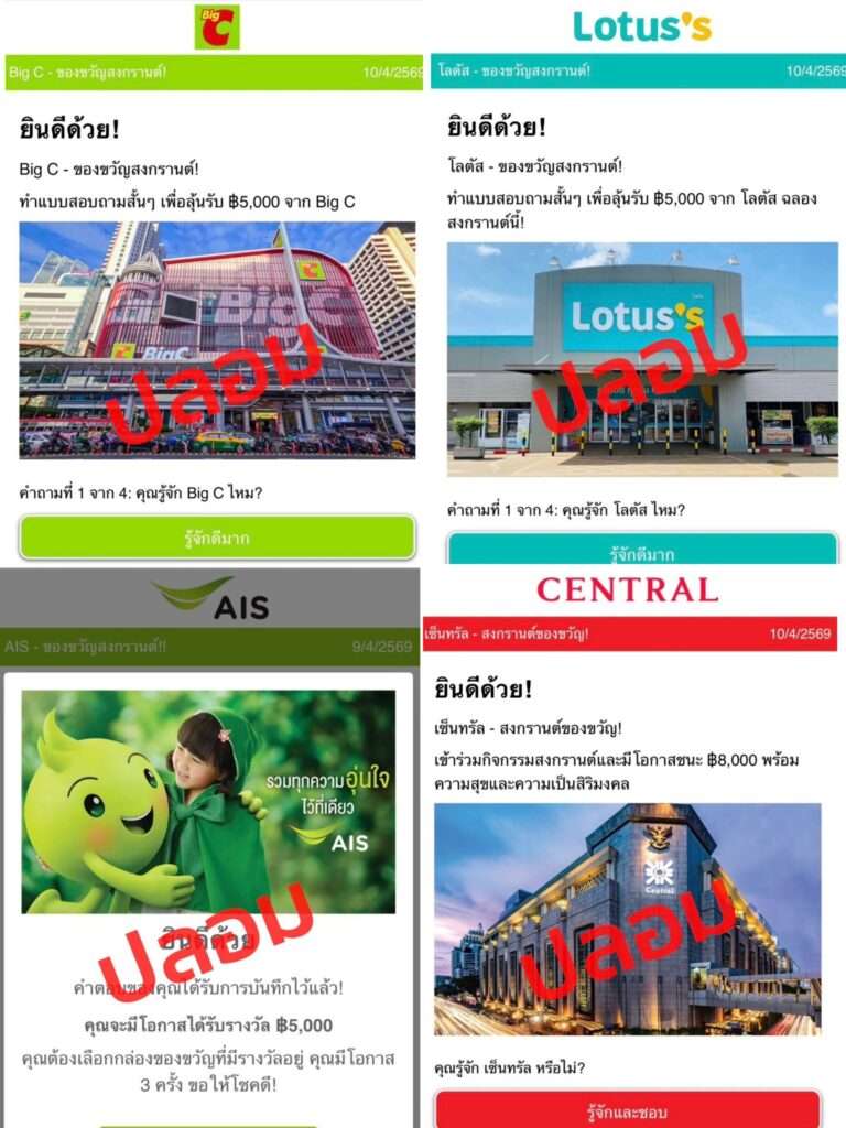 ทั้งนี้ ศูนยต่อต้านการฉ้อโกงออนไลน์ (ACSC) เตือนพี่น้องประชาชน หากพบการจัดกิจกรรม หรือเแคมเปญในช่วงสงกรานต์ที่มีการแอบอ้างแบรนด์ดัง โดยล่อใจด้วยเงินรางวัล และเร่งรัดให้รีบกด หรือคลิกลิงก์ โปรดอย่าหลงเชื่อเด็ดขาด ขอให้ตรวจสอบข้อมูลกิจกรรมผ่านช่องทางทางการของบริษัทเหล่านั้นโดยตรงก่อนทุกครั้ง เพื่อป้องกันไม่ให้ตนเองตกเป็นเหยื่อของมิจฉาชีพอีกด้วย