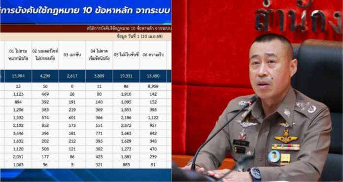 โดยในวันที่ 10 เมษายน 2569 มีการดำเนินคดี “เมาแล้วขับ” จำนวน 2,617 ราย ในจำนวนมีตรวจพบว่าเป็นผู้ที่กระทำความผิดซ้ำ จำนวน 26 ราย ซึ่งจะต้องถูกส่งฟ้องต่อศาลและมีอัตราโทษสูงขึ้นตามที่กฎหมายได้กำหนด นอกจากนี้ สถิติการบังคับใช้กฎหมายใน 10 ข้อหาหลัก (10 รสขม) รวมทั้งสิ้น 67,803 ราย โดย 3 อันดับความผิดสูงสุด ได้แก่ ไม่สวมหมวกนิรภัย 15,994 ราย, ขับรถเร็ว 13,450 ราย และไม่รัดเข็มขัดนิรภัย 3,809 ราย