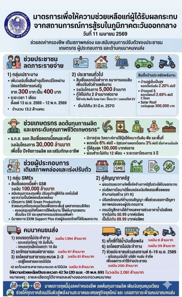 3.2 มาตรการสำหรับ SMEs กระทรวงการคลังร่วมกับธนาคารออมสินดำเนินโครงการสินเชื่อดอกเบี้ยต่ำ วงเงิน 100,000 ล้านบาท เพื่อผู้ประกอบการที่ต้องการลงทุนเพื่อปรับตัวด้านความเป็นมิตรกับสิ่งแวดล้อม ดิจิทัล เทคโนโลยี เป็นต้น, โครงการสินเชื่อ SME Green Productivity ของธนาคารพัฒนาวิสาหกิจขนาดกลางและขนาดย่อมแห่งประเทศไทย เพื่อเป็นเงินลงทุน และ/หรือเงินทุนหมุนเวียนให้กับผู้ประกอบการ SMEs ในการยกระดับและเปลี่ยนผ่านไปสู่อุตสาหกรรมสีเขียว อัตราดอกเบี้ยร้อยละ 3 ต่อปี ใน 3 ปีแรก วงเงินไม่เกิน 30 ล้านบาทต่อราย และธนาคารเพื่อการส่งออกและนำเข้าแห่งประเทศไทยได้มีมาตรการ EXIM Support Plus เพื่อเป็นเงินทุนหมุนเวียนให้กับผู้ส่งออกไทยที่ได้รับผลกระทบทั้งทางตรงหรือทางอ้อมจากสถานการณ์ดังกล่าวที่ทำให้ต้นทุนขนส่งสูงขึ้น โดยคิดอัตราดอกเบี้ยสำหรับผู้ประกอบการรายย่อย ร้อยละ 4.00 ต่อปี และยังมีโครงการประกันการส่งออกด้วยอัตราเบี้ยประกันพิเศษสำหรับประกันความเสี่ยงที่เพิ่มขึ้นจากวิกฤตตะวันออกกลาง