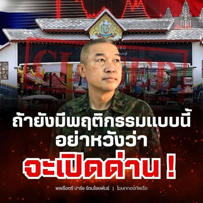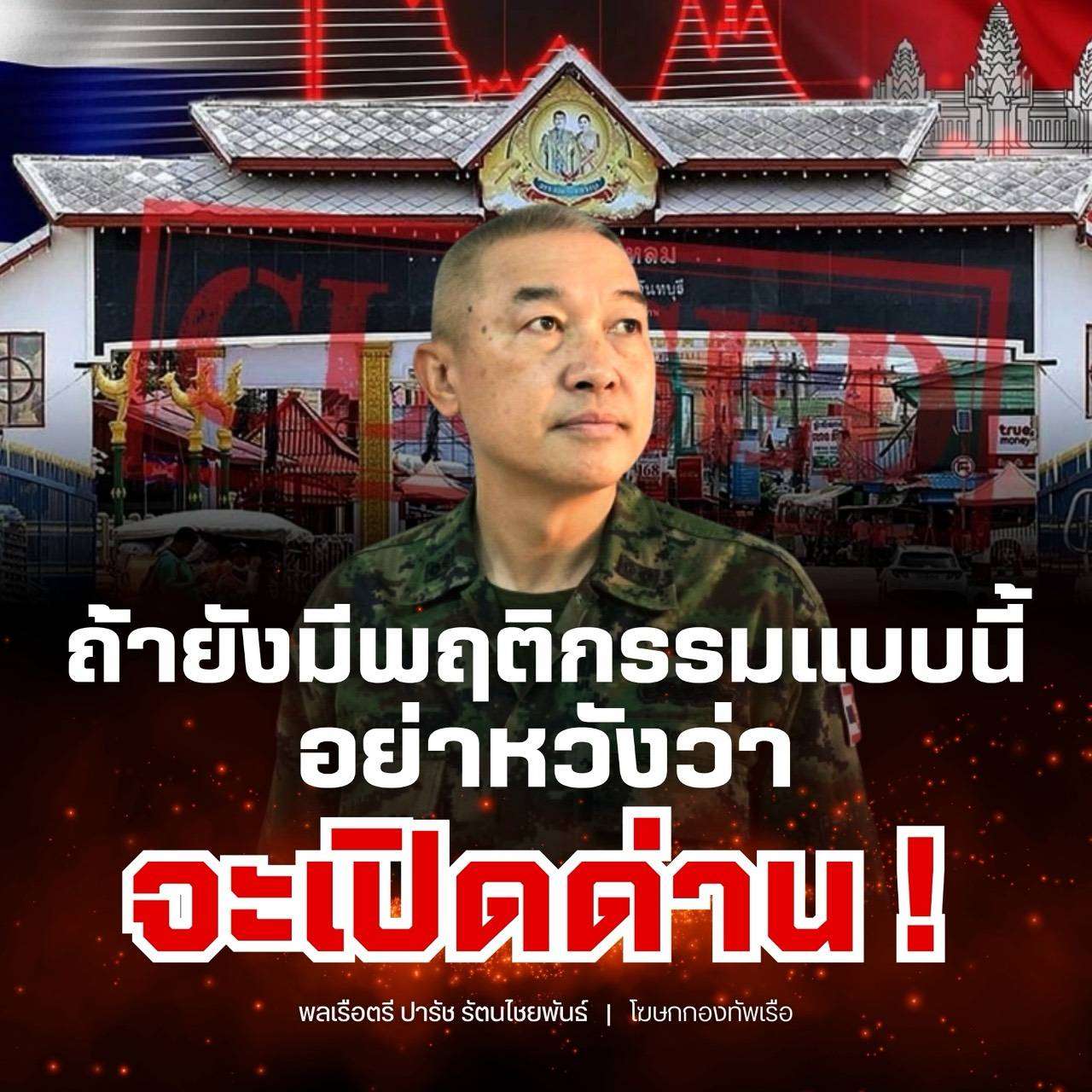 พลเรือตรี ปารัช รัตนไชยพันธ์ โฆษกกองทัพเรือ เปิดเผยว่าตามที่ปรากฏการเผยแพร่ข้อมูลในสื่อสังคมออนไลน์ อ้างว่าไทยจะเปิดช่องทางขนส่งสิ่งของบรรเทาทุกข์จากไทยไปยังกัมพูชาผ่านพื้นที่ชายแดน จันทบุรี–ตราด นั้น กองทัพเรือขอยืนยันว่า ข้อมูลดังกล่าว “ไม่เป็นความจริง” และเป็น “ข่าวปลอม (Fake News)” ที่บิดเบือนข้อเท็จจริง หากทางกัมพูชามีความต้องการความช่วยเหลือเพราะความเดือดร้อนของประชาชนที่ตกงานอดอยากแร้นแค้นในประเทศที่เกิดขึ้นเพราะผู้นำตัดสินใจผิดพลาด ก็ขอติดต่อทางข่องทางทางการทูตที่มีอยู่