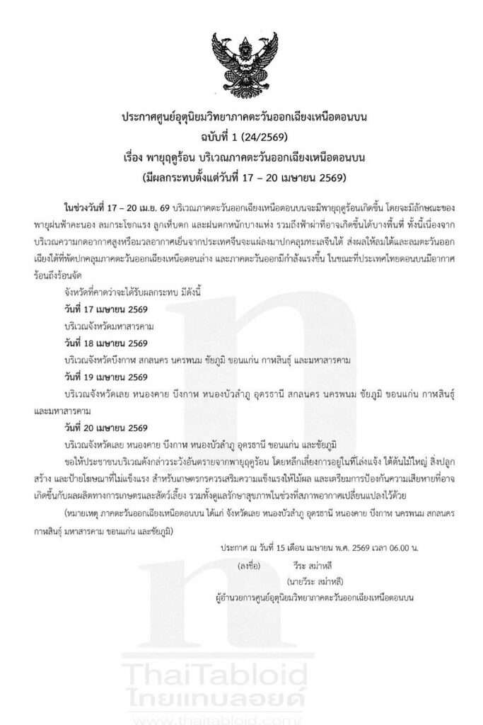 เมื่อวันที่ 15 เม.ย. 2569 ผู้สื่อข่าวไทยแทบลอยด์ รายงานว่า ศูนย์อุตุนิยมวิทยาภาคตะวันออกเฉียงเหนือตอนบน ออกประกาศฉบับที่ 2 (24/2569) เตือนสถานการณ์ “พายุฤดูร้อน” ว่า : ในพื้นที่ภาคอีสานตอนบน ระหว่างวันที่ 17–20 เมษายน 2569 โดยระบุว่า จะเกิดสภาพอากาศแปรปรวนรุนแรงในหลายพื้นที่