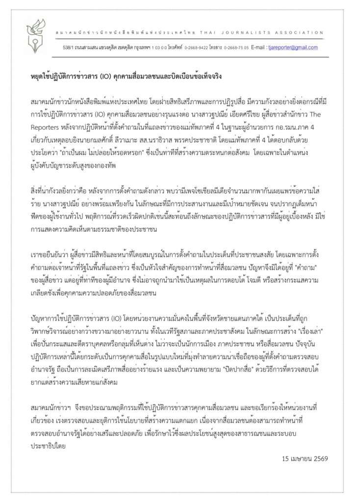 วันที่ 15 เมษายน 2569 สมาคมนักข่าวนักหนังสือพิมพ์แห่งประเทศไทย โดยฝ่ายสิทธิเสรีภาพและการปฏิรูปสื่อ มีความกังวลอย่างยิ่งต่อกรณีที่มีการใช้ปฏิบัติการข่าวสาร (IO) คุกคามสื่อมวลชนอย่างรุนแรงต่อ นางสาวฐปนีย์ เอียดศรีไชย ผู้สื่อข่าวสำนักข่าว The Reporters หลังจากปฏิบัติหน้าที่ตั้งคำถามในที่แถลงข่าวของแม่ทัพภาคที่ 4 ในฐานะผู้อำนวยการ กอ.รมน.ภาค 4 เกี่ยวกับเหตุลอบยิงนายกมลศักดิ์ ลีวาเมาะ สส.นราธิวาส พรรคประชาชาติ โดยแม่ทัพภาคที่ 4 ได้ตอบกลับด้วยประโยคว่า “ถ้าเป็นผม ไม่ปล่อยให้รอดหรอก” ซึ่งเป็นท่าทีที่สร้างความตระหนกต่อสังคม โดยเฉพาะในตำแหน่งผู้บังคับบัญชาระดับสูงของกองทัพ