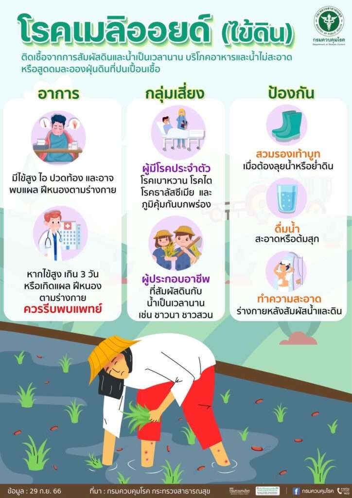 นางสาวลลิดา กล่าวว่า โรคเมลิออยด์โดสิสเกิดจากเชื้อแบคทีเรียที่พบในดินและน้ำ สามารถเข้าสู่ร่างกายผ่านบาดแผล การหายใจเอาฝุ่นดิน หรือการดื่มน้ำที่ปนเปื้อนเชื้อ โดยอาการมีได้ทั้งแบบเฉียบพลันและเรื้อรัง ตั้งแต่มีไข้สูง หายใจลำบาก แน่นหน้าอก ไปจนถึงมีแผลบวมแดงหรือฝีหนอง ซึ่งหากเชื้อเข้าสู่กระแสเลือด อาจทำให้เกิดภาวะติดเชื้อรุนแรงและเสียชีวิตได้ สำหรับกลุ่มเสี่ยง ได้แก่ เกษตรกร ชาวนา ผู้ที่ทำงานสัมผัสดินและน้ำ รวมถึงผู้ป่วยโรคเรื้อรัง เช่น เบาหวาน โรคไต ธาลัสซีเมีย และผู้ที่มีภูมิคุ้มกันบกพร่อง ซึ่งมีโอกาสเกิดอาการรุนแรงสูงกว่ากลุ่มอื่น