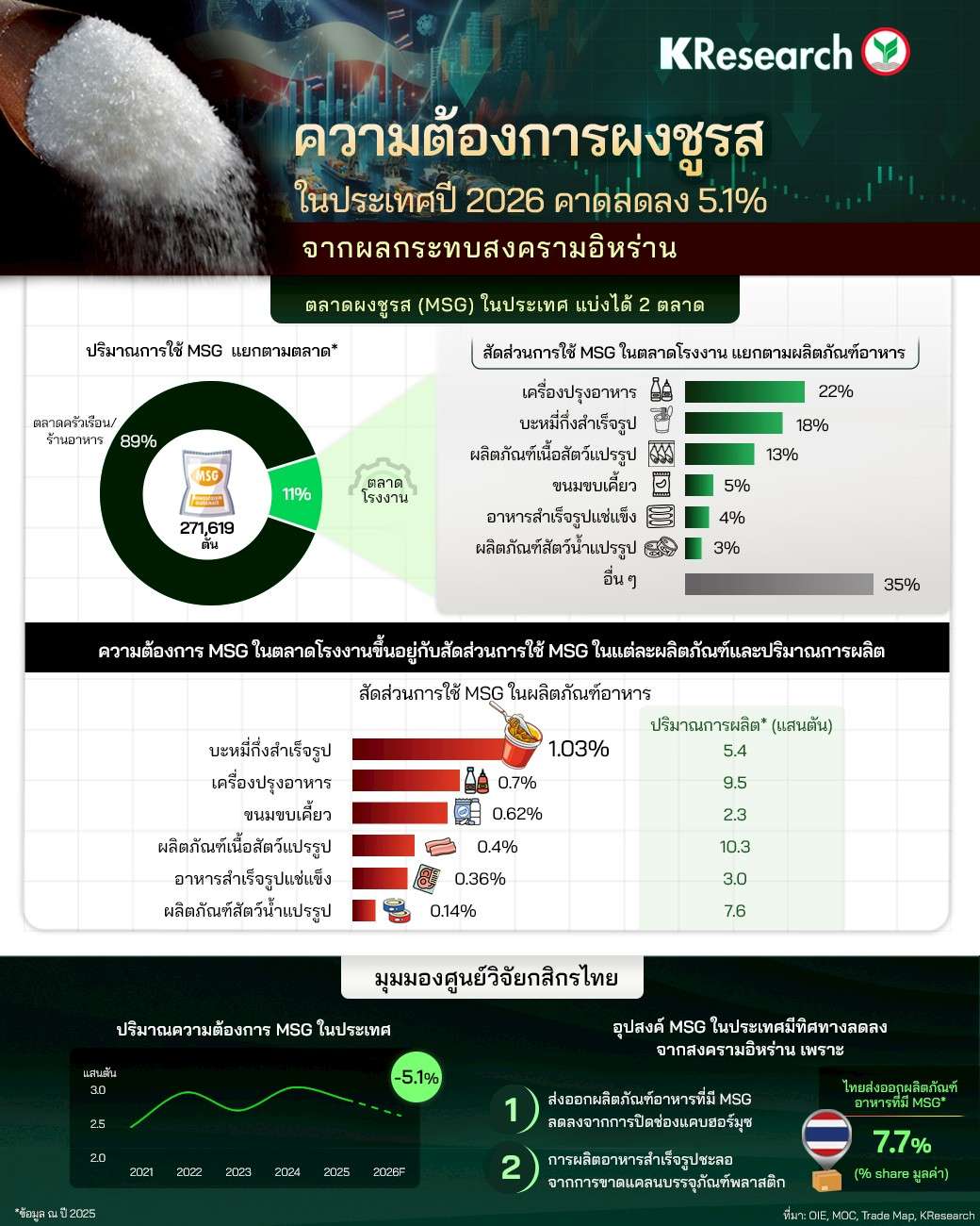 กรุงเทพฯ, วันที่ 19 เม.ย. – จากสถานการณ์สู้รบในตะวันออกกลางนอกจากจะส่งผลกระทบโดยตรงกับวิกฤติพลังงานแล้ว ศูนย์วิจัยกสิกรไทย ชี้ว่ายังส่งผลกระทบต่ออุตสาหกรรมผงชูรส (MSG) ด้วย โดยคาดการณ์ว่าความต้องการในประเทศปี 2026 จะลดลง 5.1% จากผลกระทบสงครามอิหร่าน เพราะการส่งออกผลิตภัณฑ์อาหารที่มี MSG มีทิศทางหดตัวจากการปิดช่องแคบฮอร์มุซ โดยไทยส่งออกผลิตภัณฑ์อาหารที่มี MSG ไปตะวันออกกลางคิดเป็น 7.7% ของการส่งออกทั้งหมดในปี 2025 นอกจากนี้ การผลิตอาหารสำเร็จรูปไทยมีแนวโน้มชะลอตัว จากการขาดแคลนบรรจุภัณฑ์พลาสติก
