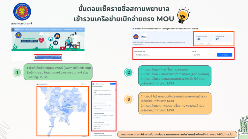 ปัจจุบัน (ข้อมูล ณ วันที่ 18 เมษายน 2569) มีสถานพยาบาลเข้าร่วมโครงการแล้ว 109 แห่ง ครอบคลุม 47 จังหวัดทั่วประเทศ และมีการขยายเครือข่ายอย่างต่อเนื่อง โดยสมาชิกสามารถตรวจสอบรายชื่อสถานพยาบาลที่เข้าร่วมแบบ Real-Time ได้ที่เว็บไซต์กองทุนสงเคราะห์ครูเอกชน www.aidfunds.org หรือผ่านระบบค้นหา https://www.aidfunds.org/HCH