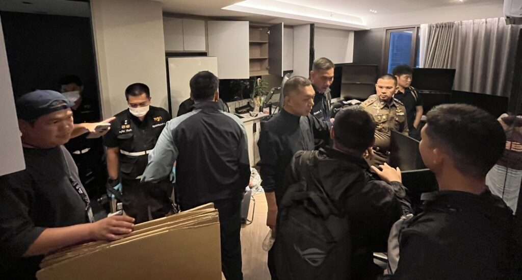 กระทั่งวันที่ 18 เม.ย. เจ้าหน้าที่ขอหมายค้นจากศาลอาญากรุงเทพใต้ เข้าตรวจค้นหลายจุด พบผู้ต้องหาชาวเกาหลีใต้รวม 6 ราย พร้อมของกลางกระจายอยู่หลายห้อง ทั้งคอมพิวเตอร์ตั้งโต๊ะ จอคอมพิวเตอร์ โน้ตบุ๊ก โทรศัพท์มือถือ iPhone iPad MacBook อุปกรณ์จัดเก็บข้อมูล และเงินสดทั้งสกุลบาทและวอนจำนวนมาก