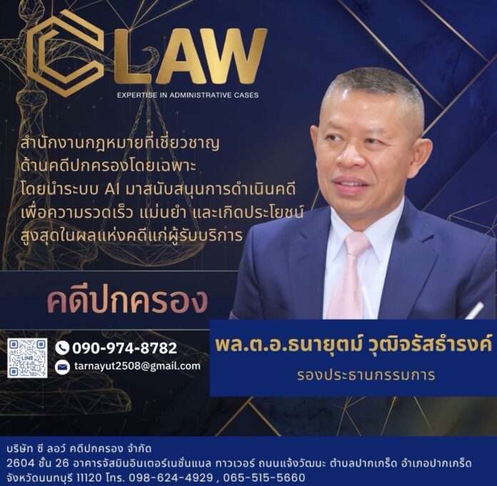 เมื่อวันที่ 19 เมษายน 2569 “พล.ต.อ.ธนายุตม์ วุฒิวิรัสธำรงค์ อดีตที่ปรึกษา ตร. เปิดเผยว่า ได้มีการเปิดตัวสำนักงานกฎหมายยุคใหม่ เน้นคดีปกครองโดยเฉพาะ วงการกฎหมายไทยเริ่มขยับเข้าสู่ยุคดิจิทัลอย่างเต็มรูปแบบ เมื่อ บริษัท ซี ลอว์ คดีปกครอง จำกัด ประกาศเปิดตัวสำนักงานกฎหมายที่มุ่งเน้นความเชี่ยวชาญเฉพาะด้าน “คดีปกครอง” โดยตรง พร้อมนำระบบ Artificial Intelligence (AI) เข้ามาสนับสนุนกระบวนการทำงานทางกฎหมายอย่างเป็นระบบ