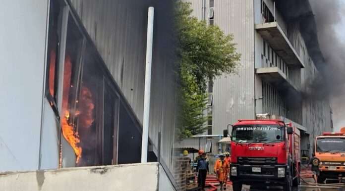 เมื่อเวลา 12.00 น. วันที่ 19 เม.ย. 69 เจ้าหน้าที่สภ.บางบัวทอง รับแจ้งเหตุเพลิงไหม้โกดังโรงงานผลิตแว่นตาแห่งหนึ่งย่านบางบัวทอง ต.ละหาร อ.บางบัวทอง จ.นนทบุรี จึงพร้อมด้วยรถน้ำจากเทศบาลนครบางบัวทอง, เทศบาลเมืองพิมลราช, เทศบาลเมืองบางรักพัฒนา, องค์การบริหารส่วนตำบลละหาร, องค์การบริหารส่วนตำบลคลองข่อย, เทศบาลนครนนทบุรี และใกล้เคียงจำนวนกว่า 10 คัน ระดมฉีดน้ำ ใช้เวลากว่า 1 ชั่วโมง ยังไม่สามารถควบคุมเพลิงได