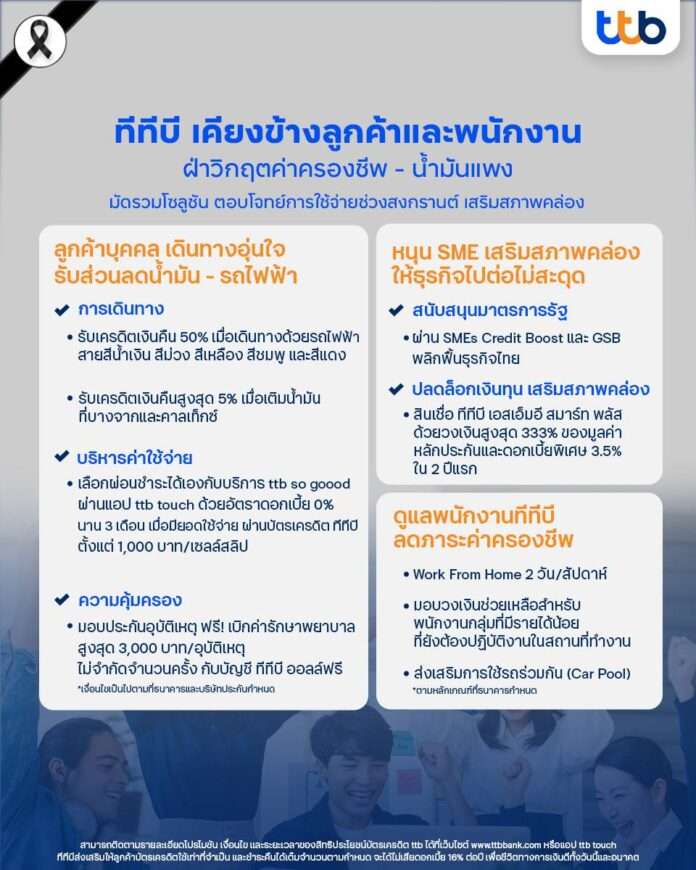 ทีทีบี ยืนหยัดเคียงข้างคนไทยในทุกสถานการณ์ เดินหน้าดูแลทั้งลูกค้าบุคคล ลูกค้า SME และพนักงานทั่วประเทศ เพื่อบรรเทาผลกระทบจากภาวะค่าครองชีพและราคาน้ำมันที่ปรับตัวสูงขึ้น โดยเฉพาะในช่วงเทศกาลสงกรานต์ที่มีค่าใช้จ่ายเพิ่มขึ้นอย่างมีนัยสำคัญ ด้วยโซลูชันทางการเงินที่ตอบโจทย์อย่างตรงจุด ช่วยเสริมสภาพคล่อง ลดภาระค่าใช้จ่าย และสนับสนุนการขับเคลื่อนเศรษฐกิจไทยให้เดินหน้าต่อได้อย่างมั่นคงท่ามกลางความผันผวน