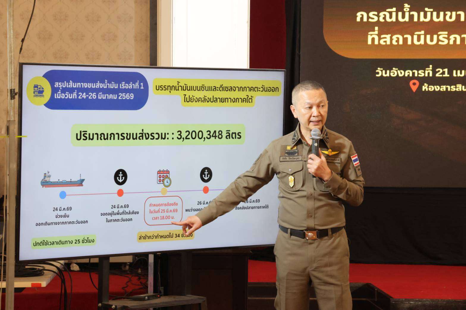 เมื่อเวลา 15.00 น. วันที่ 21 เม.ย. ที่สำนักงานตำรวจแห่งชาติ (ตร.) พล.ต.อ.ธัชชัย ปิตะนีละบุตร รองผู้บัญชาการตำรวจแห่งชาติ ในฐานะผู้อำนวยการศูนย์ปราบปรามการกระทำความผิดเกี่ยวกับน้ำมันเชื้อเพลิง สำนักงานตำรวจแห่งชาติ (ศปนม.ตร.) แถลงข่าวผลการปฏิบัติการตรวจสอบเรือบรรทุกน้ำมันต้องสงสัยในพื้นที่อ่าวไทย ซึ่งสืบเนื่องจากปัญหาการขาดแคลนน้ำมันในสถานีบริการทั่วประเทศในช่วงสถานการณ์วิกฤตระหว่างวันที่ 21-25 มีนาคม 2569 ภายหลังเกิดเหตุการณ์ปิดช่องแคบฮอร์มุส