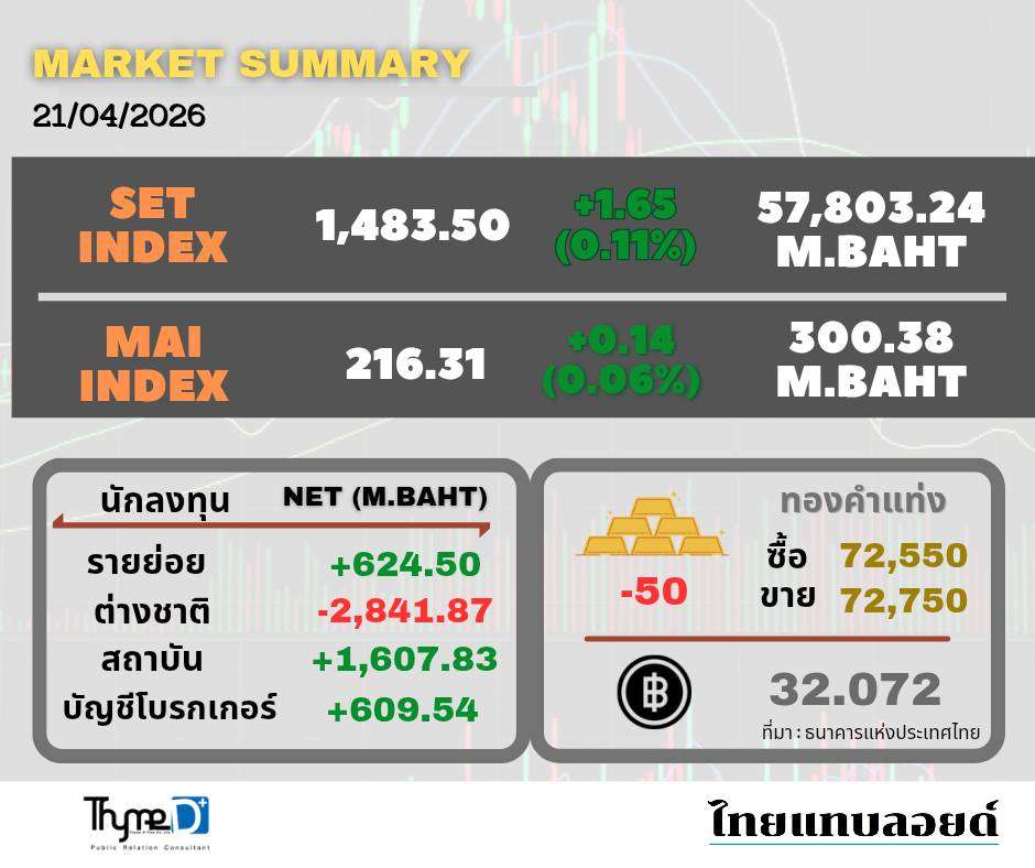 ตลาดหุ้นไทยปิดวันนี้ที่ระดับ 1,483.50 จุด เพิ่มขึ้น 1.65 จุด (+0.11%) มูลค่าซื้อขาย 57,803.24 ล้านบาท